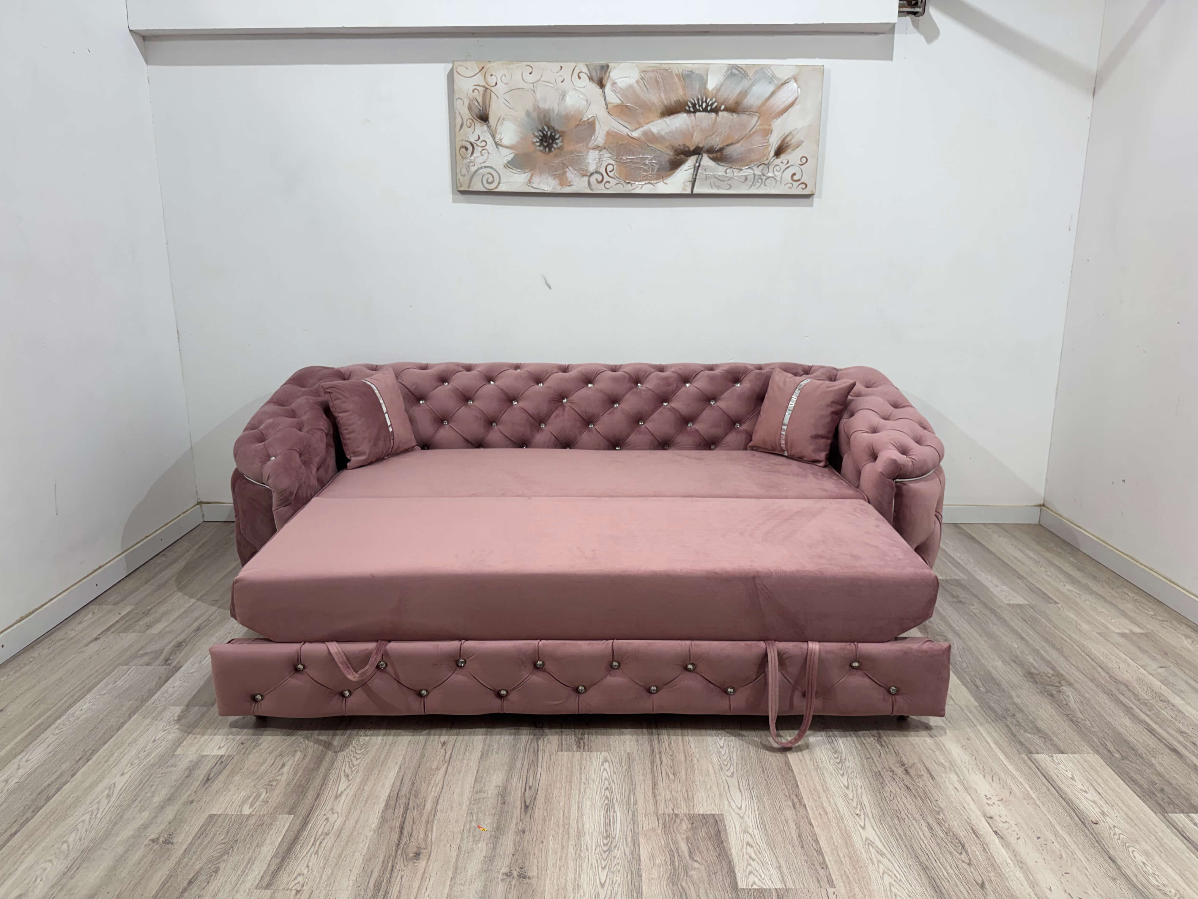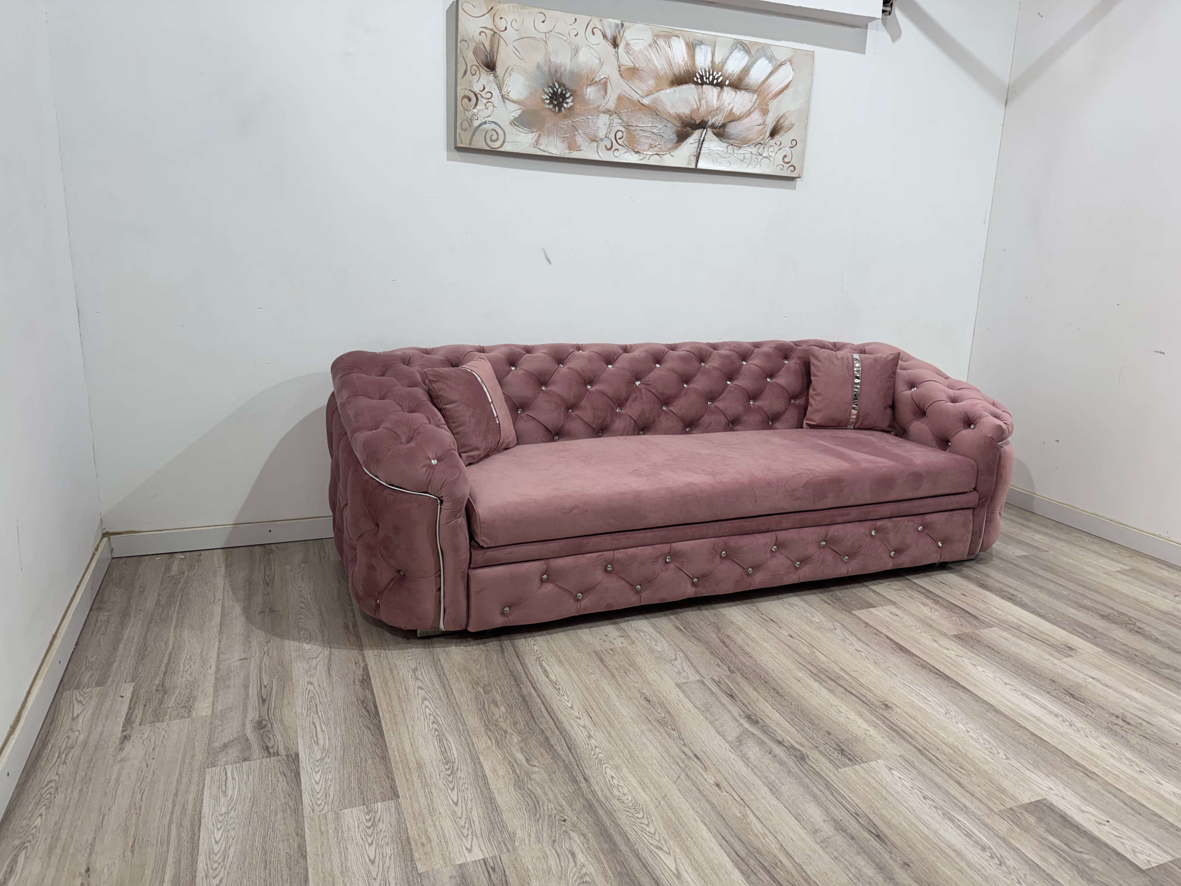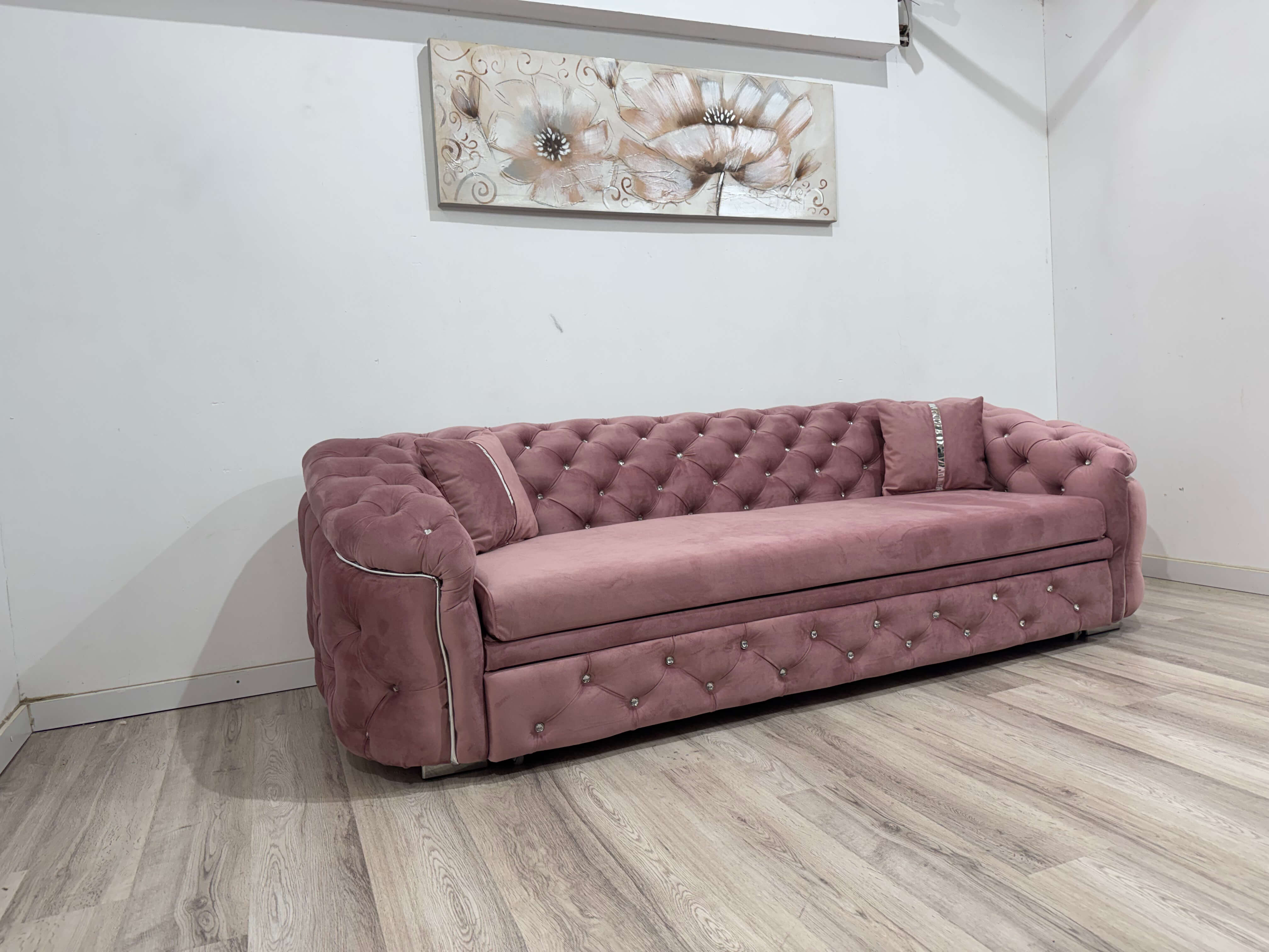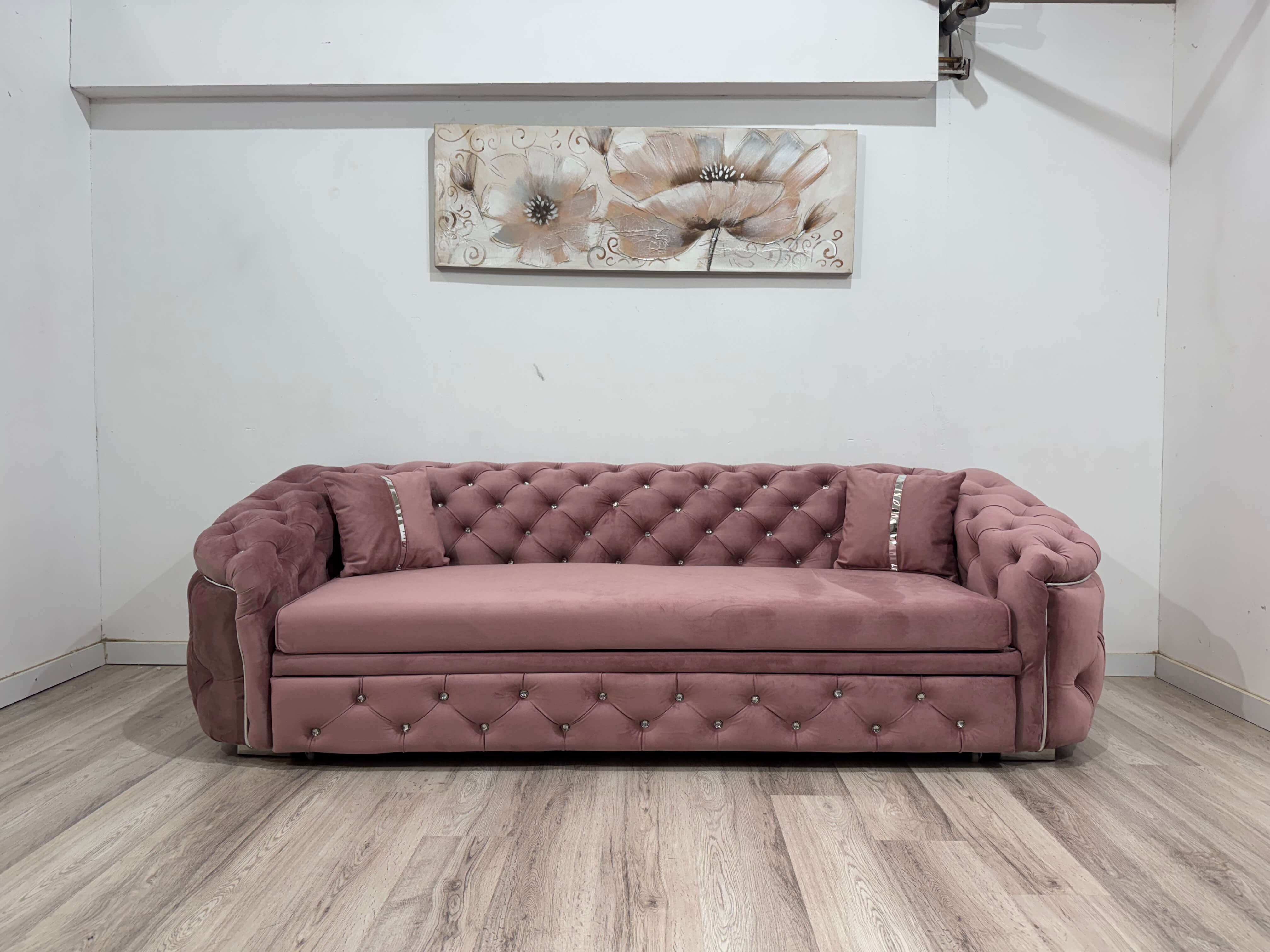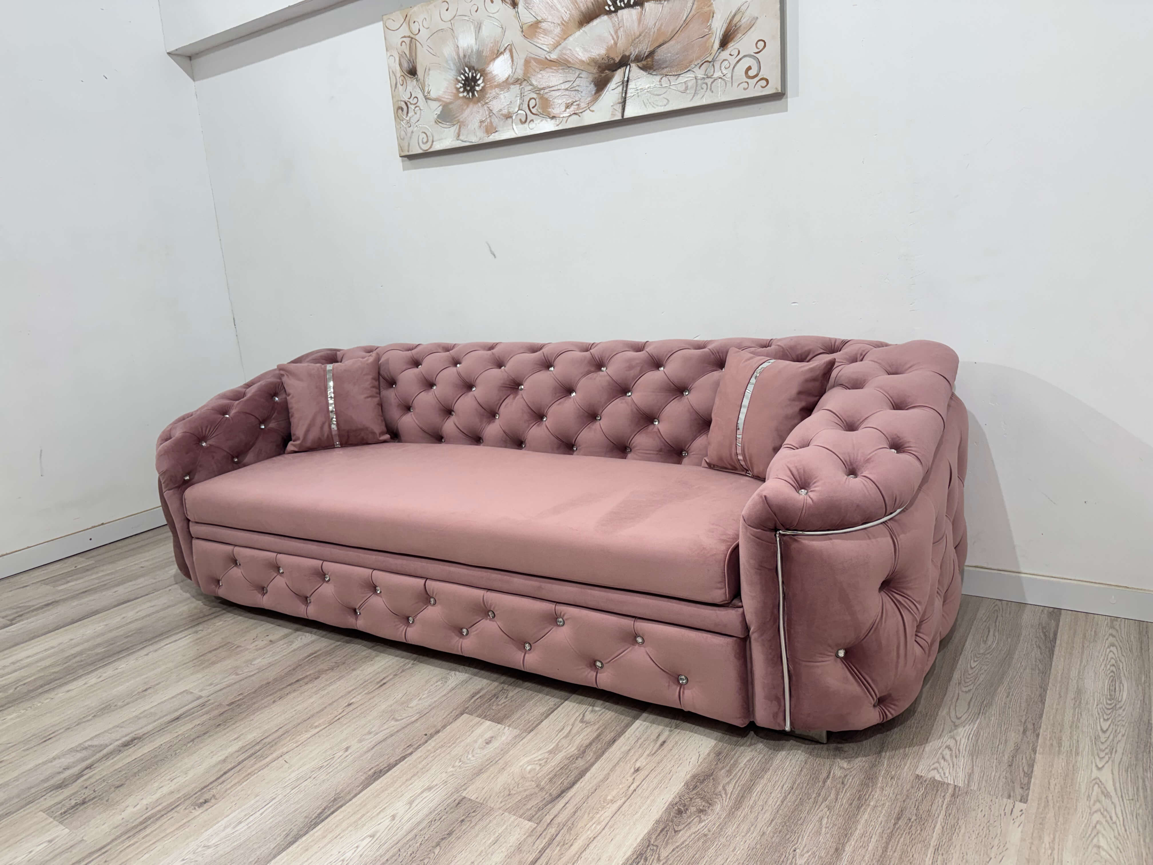 Canapea extensibilă 3 locuri 250 x 90 cm, stil Chesterfield cu inserții argintii, roz pudră – model DIVA