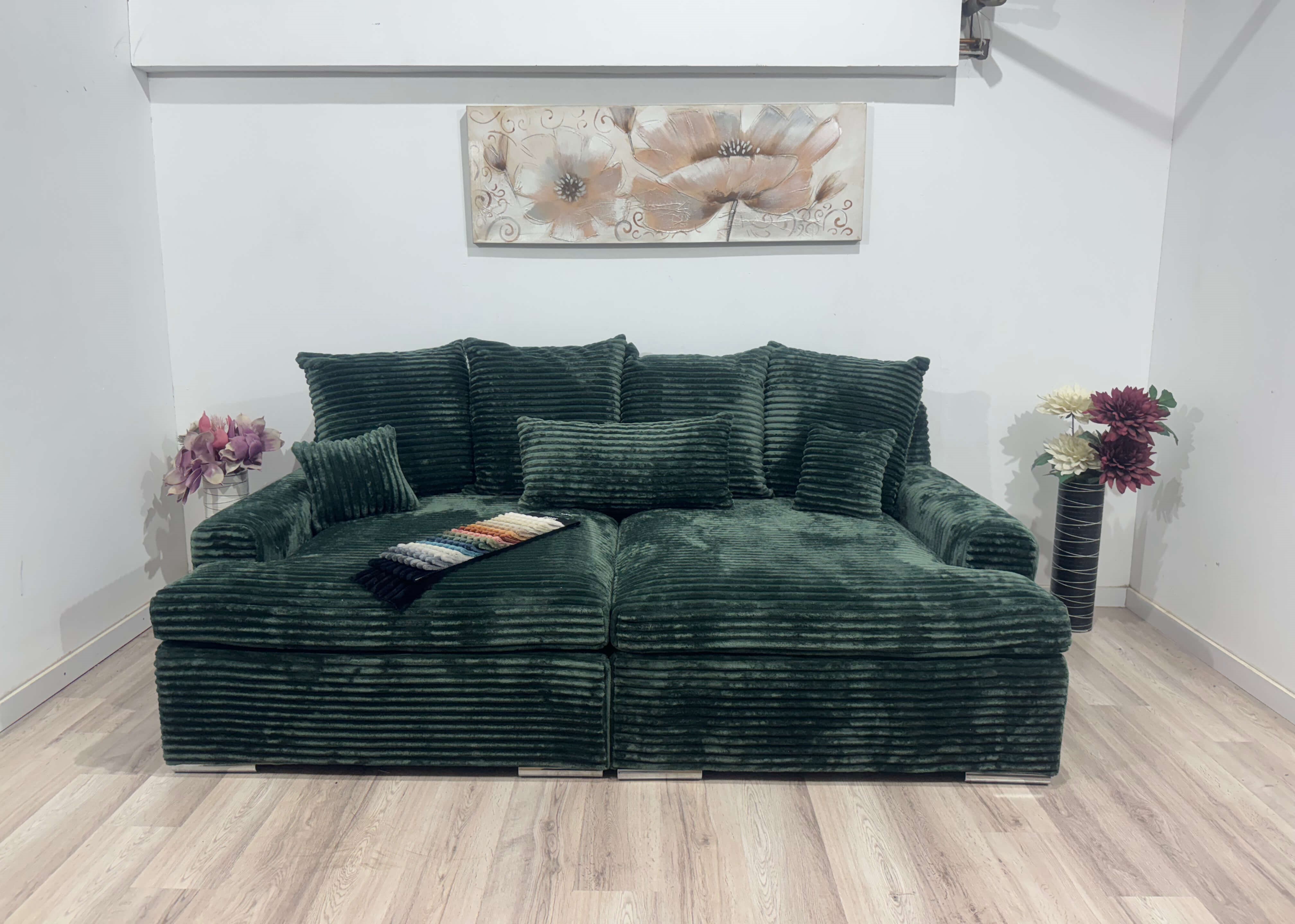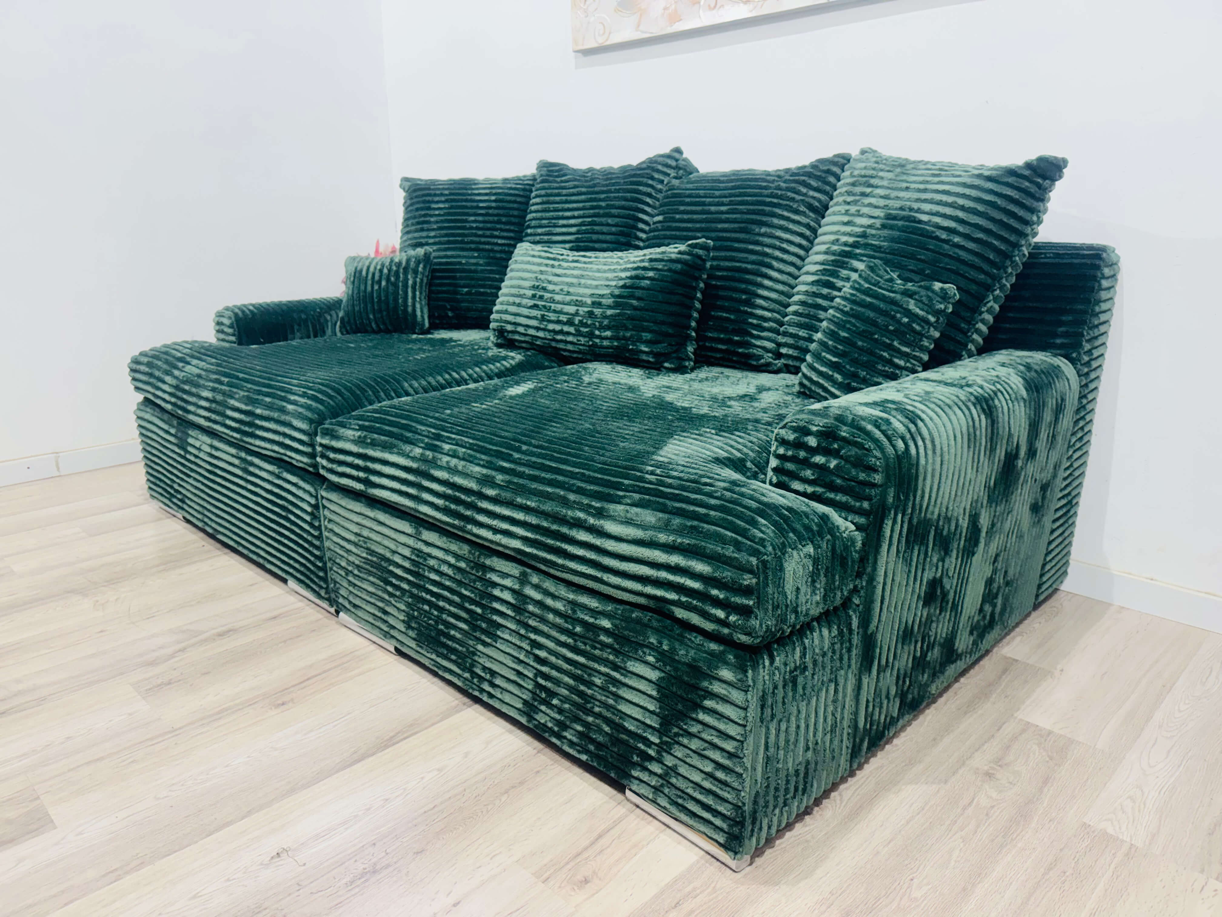 Tapițeria este realizată dintr-un material plușat cu textură în relief, plăcut la atingere și rezistent în timp. Designul său compact și bine proporționat este accentuat de cele două brațe laterale elegante și de cele 7 perne decorative, dintre care 4 sunt mari și 3 mici, oferind susținere excelentă pentru spate și un plus estetic greu de trecut cu vederea.
