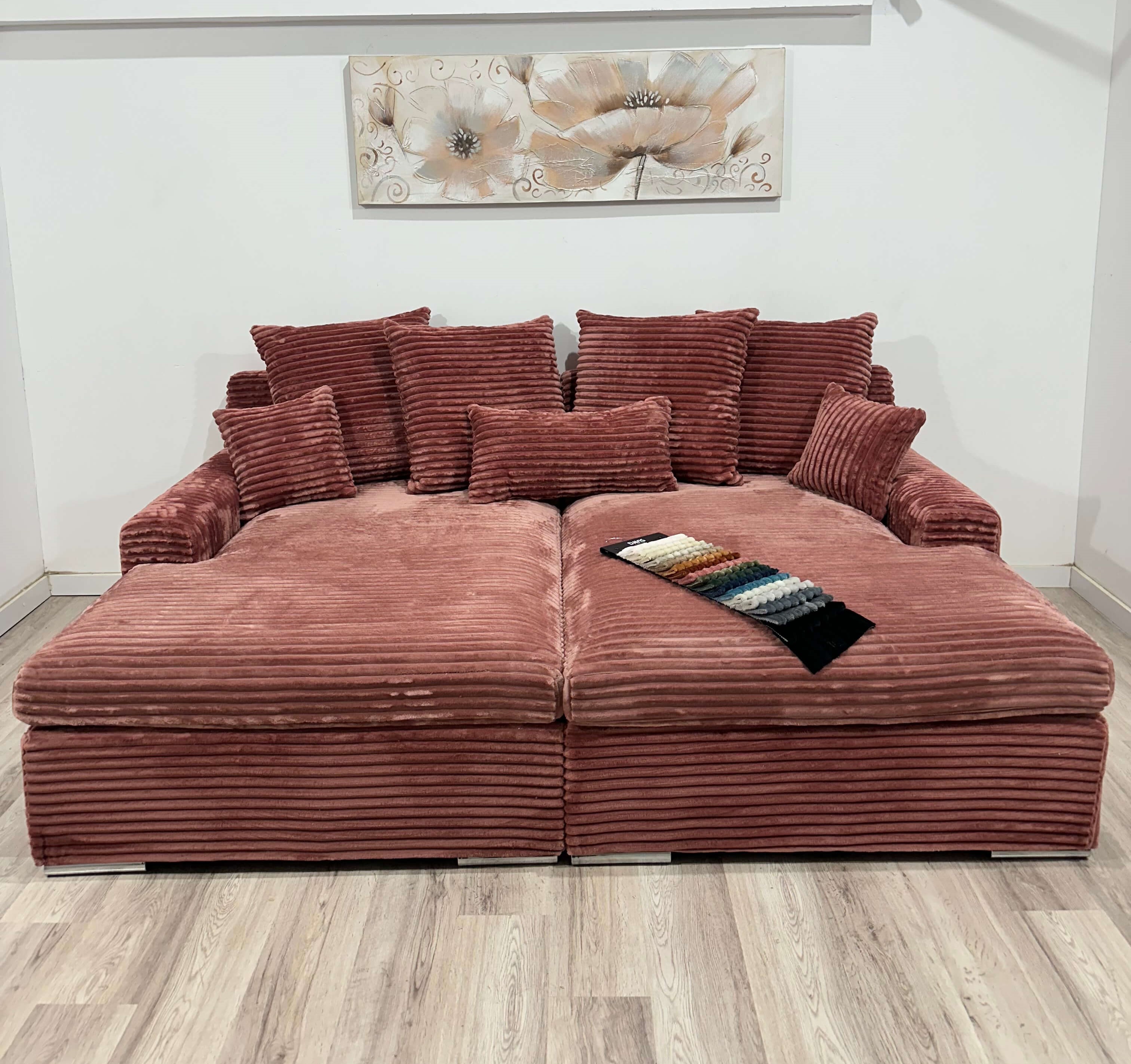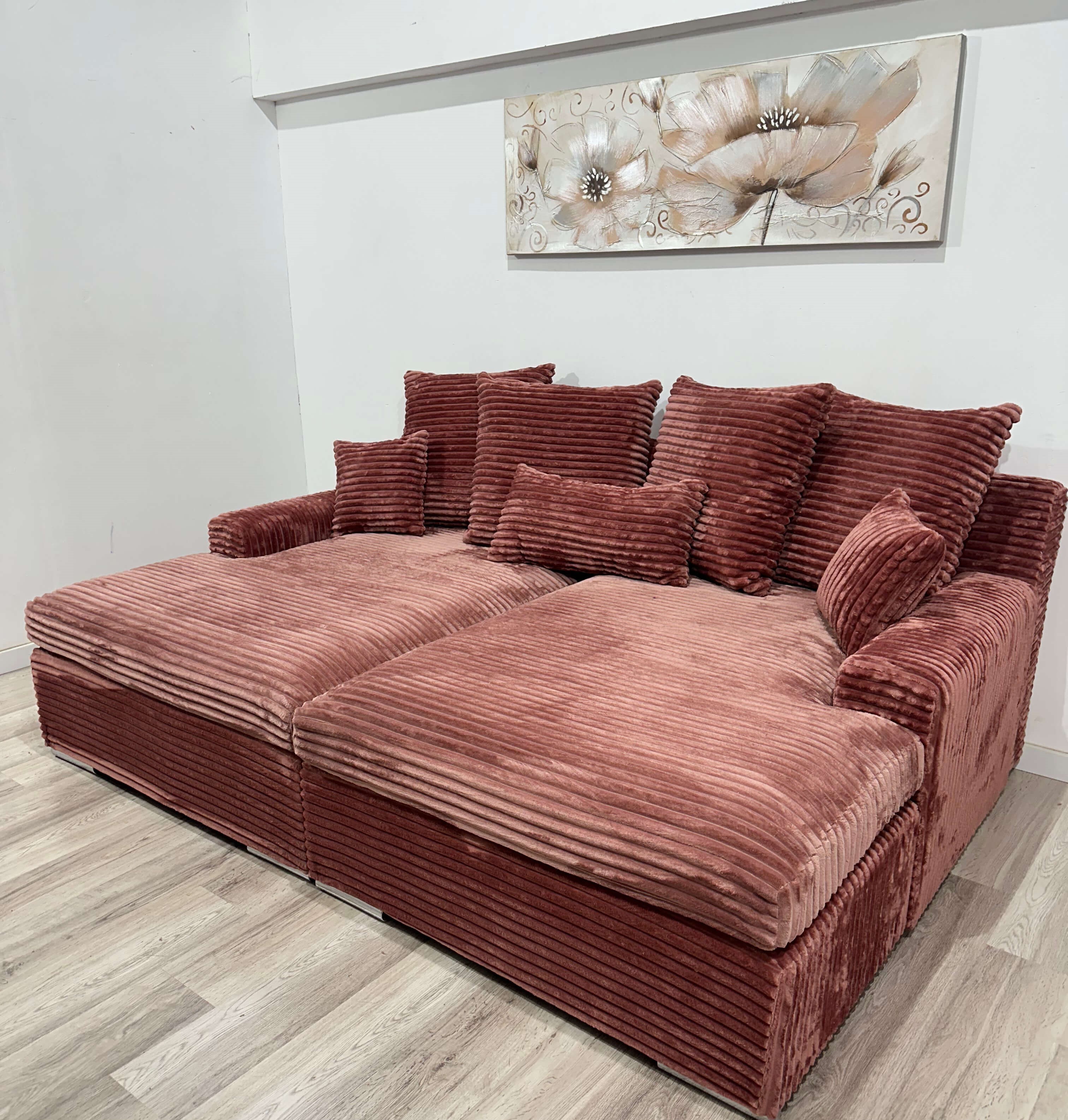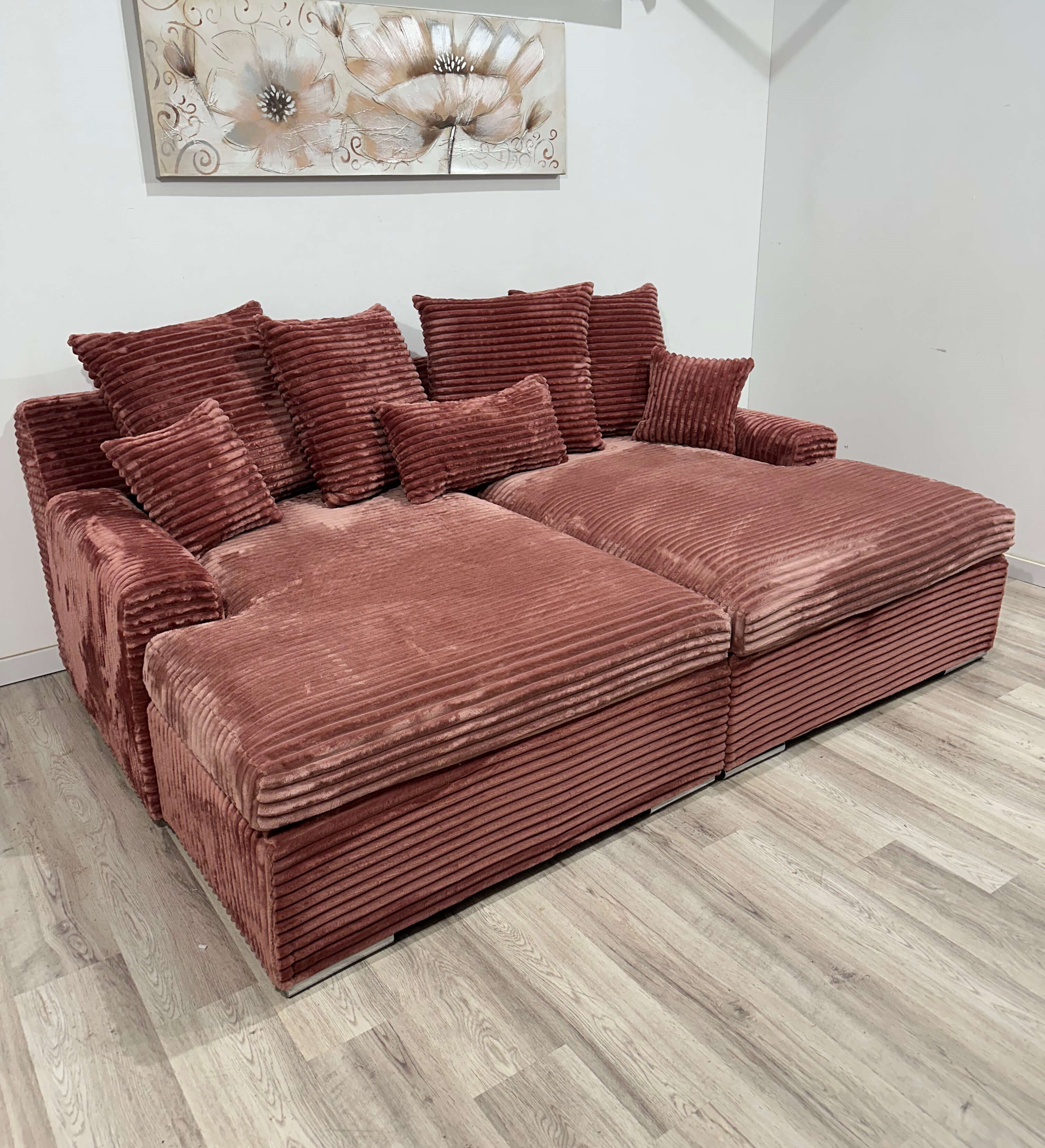 Canapea fixă modernă cu 4 locuri, ideală pentru spații generoase, material plușat, realizată dintr-un burete special și arcuri sinuzoidale, două brațe elegante, picioare din plastic dur, 4 perne mari și 3 perne mici, cu dimensiunea totală de 235 x 165 cm.