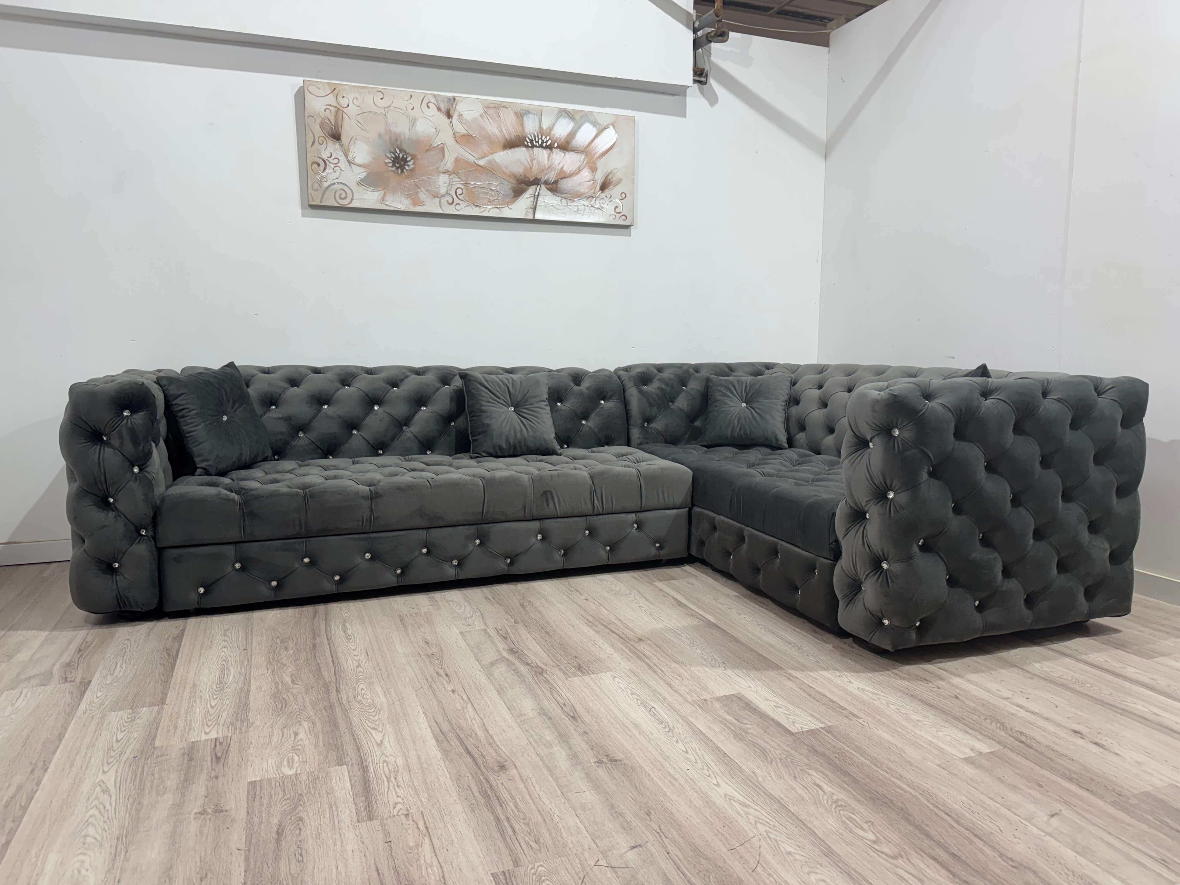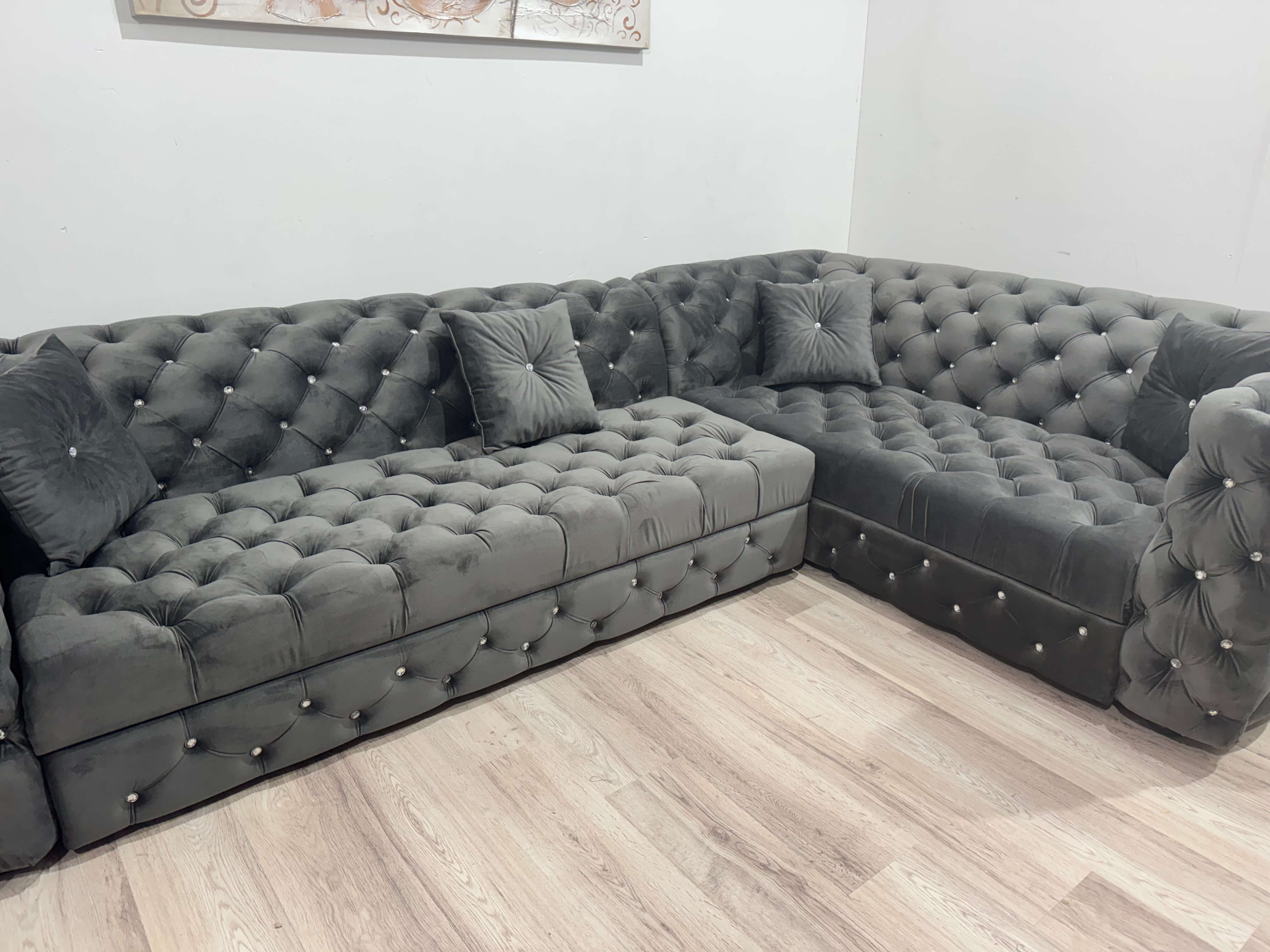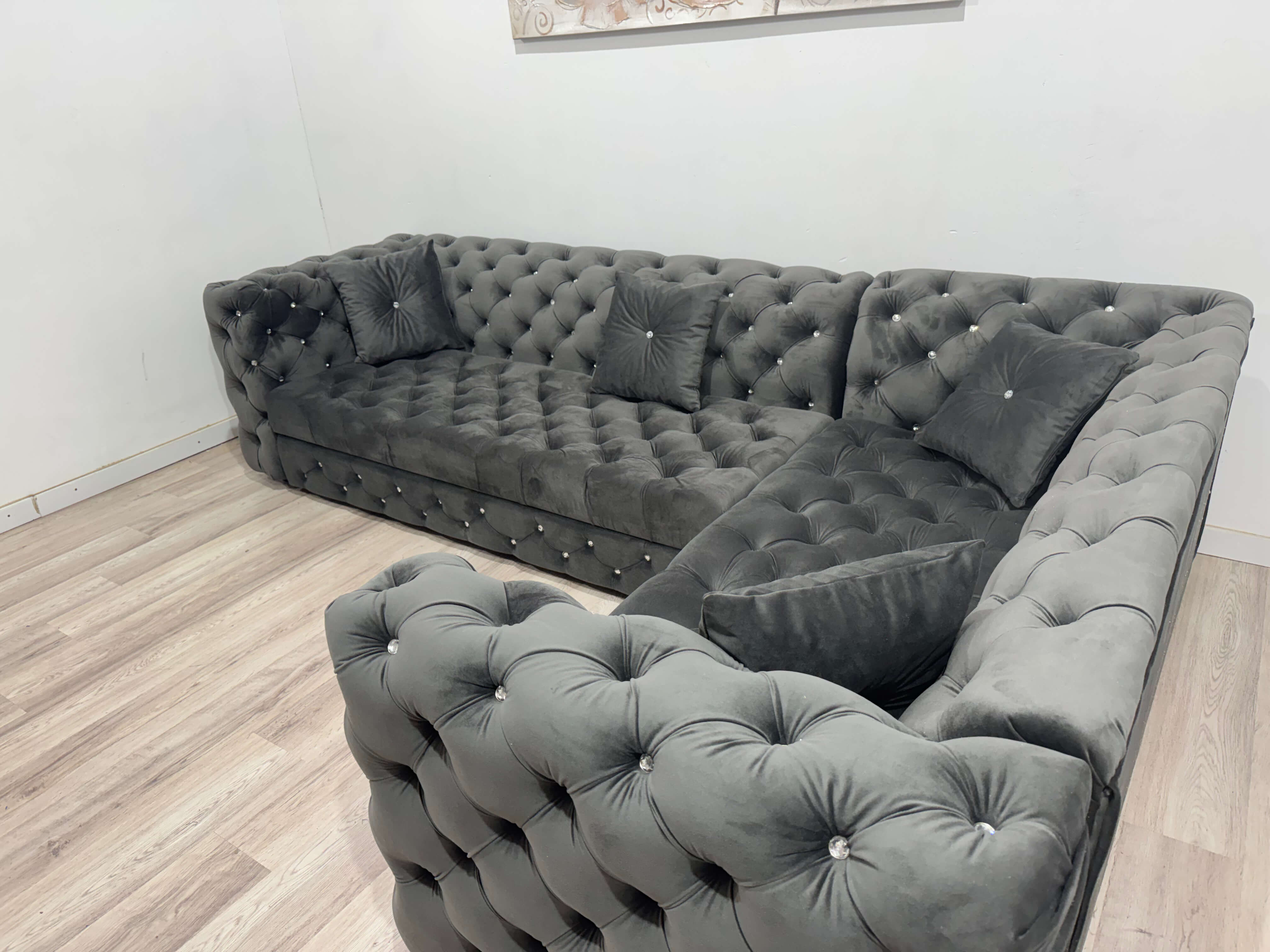 Colțar extensibil 5 locuri 300 x 200 cm, extensie metalică și nasturi din sticlă, gri – model MONZA