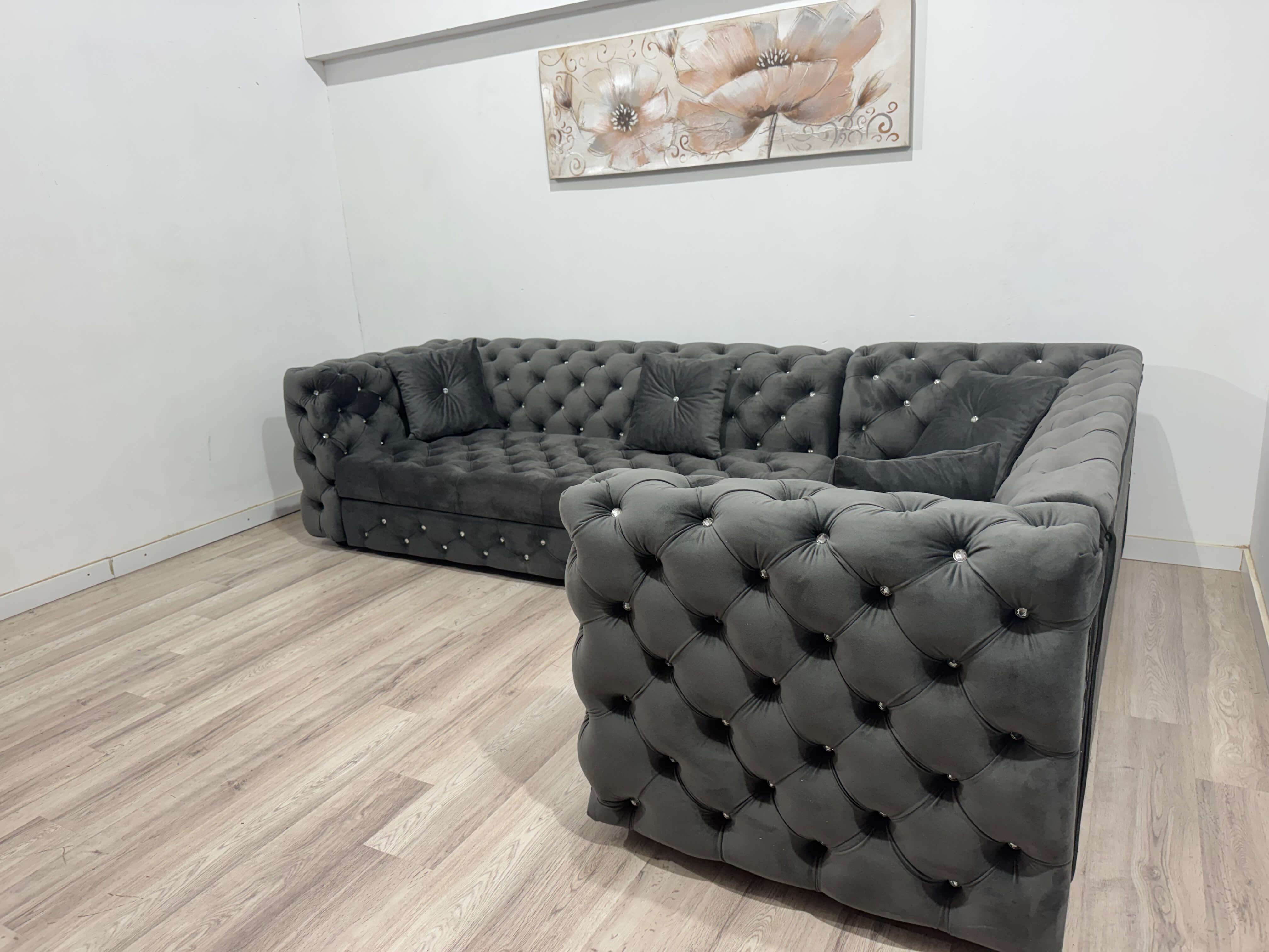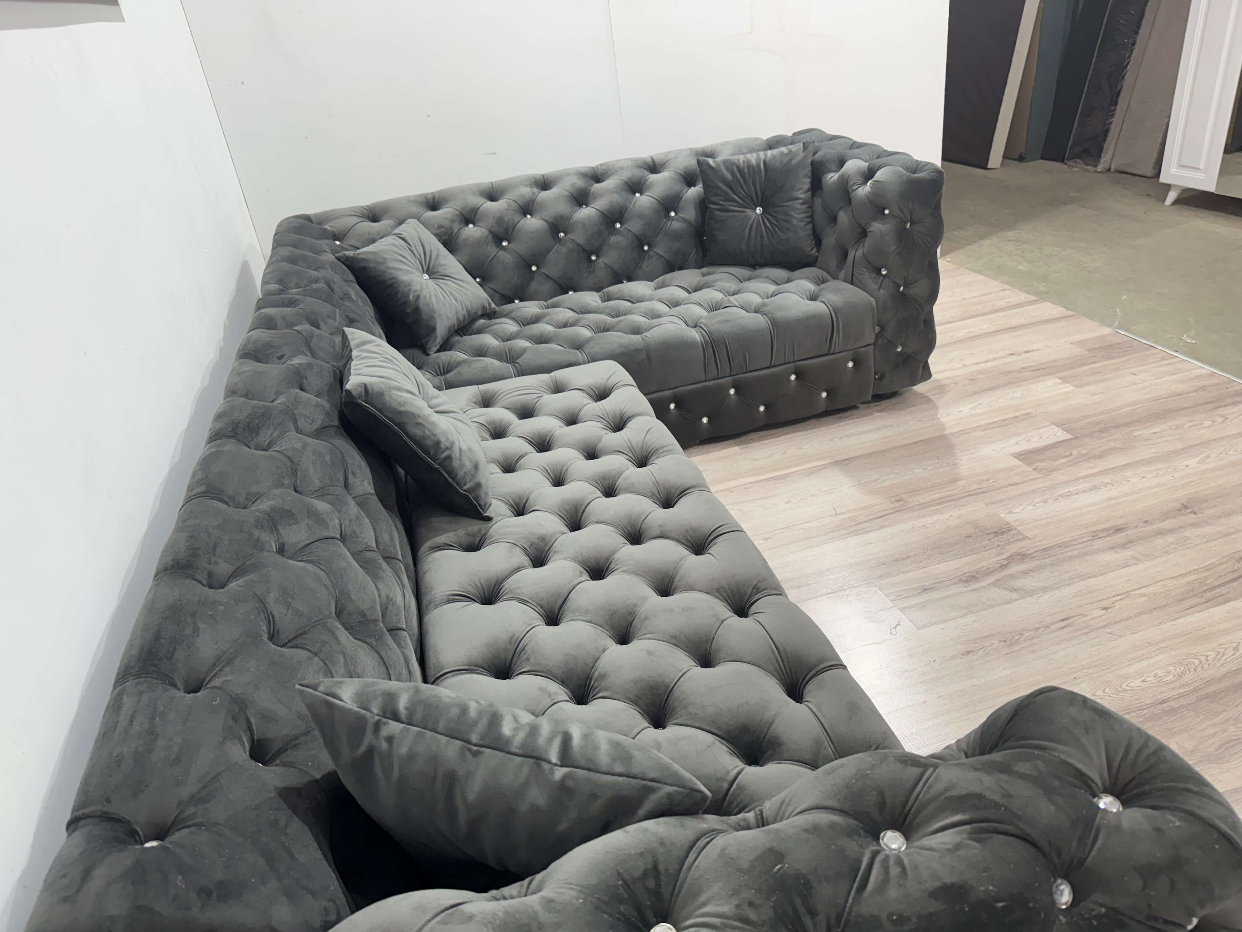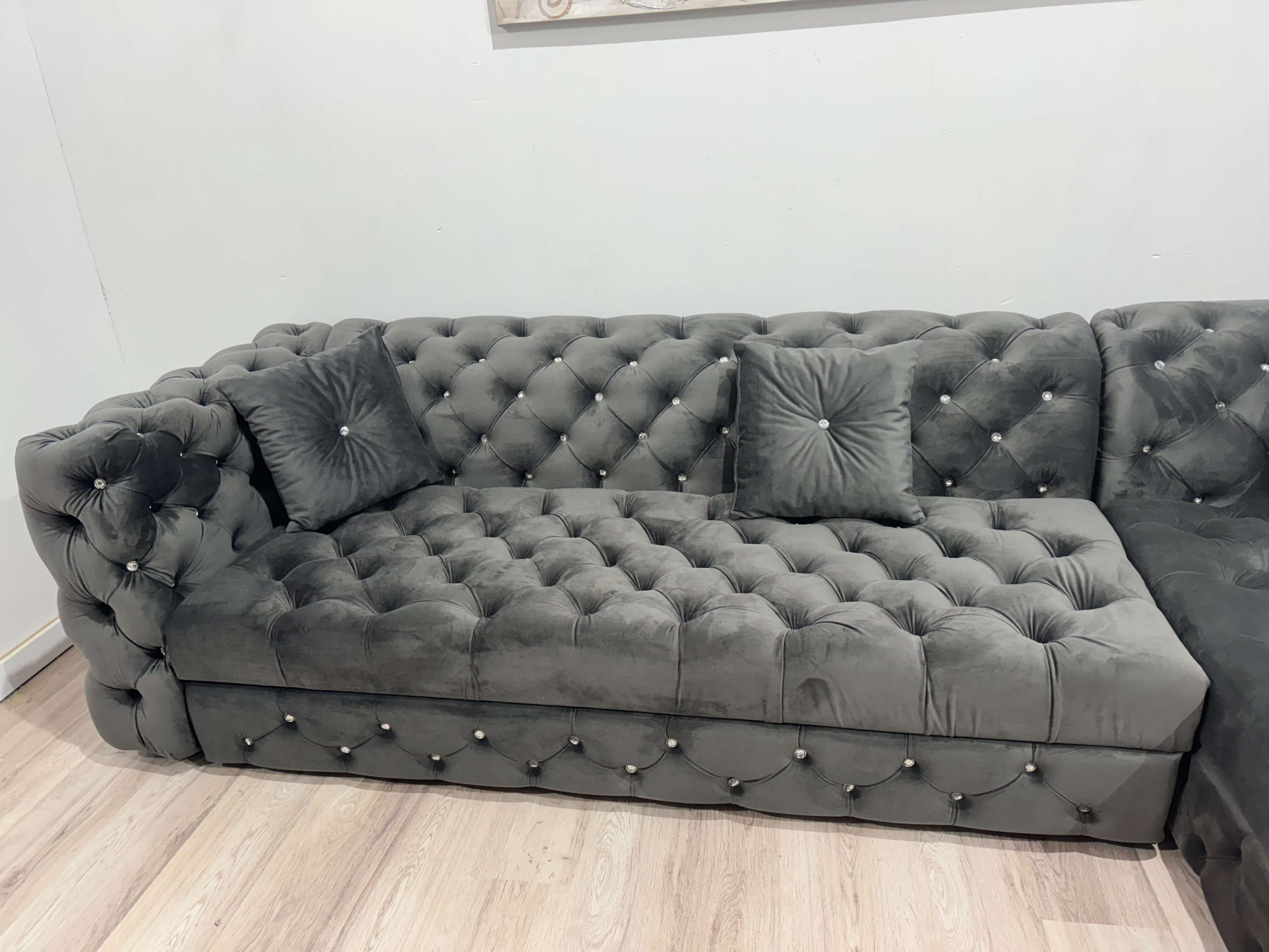 Designul în stil Chesterfield, cu nasturi din sticlă aplicați manual, oferă un efect vizual spectaculos. Modelul este prezent atât pe spătar, cât și pe șezut, ceea ce îi conferă un aspect premium, complet și echilibrat. Catifeaua fină adaugă profunzime culorii și un plus de rafinament, iar textura moale oferă o senzație plăcută la atingere.