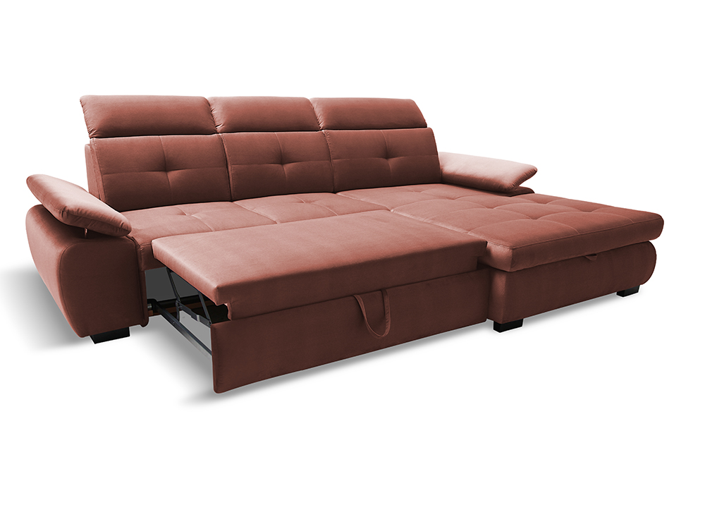 Funcționalitatea este completată perfect de sistemul de extensie metalică tip sertar, ce transformă rapid colțarul într-un spațiu de dormit confortabil, iar sub șezut se regăsește o ladă de depozitare încăpătoare, ideală pentru lenjerii, perne sau pături.