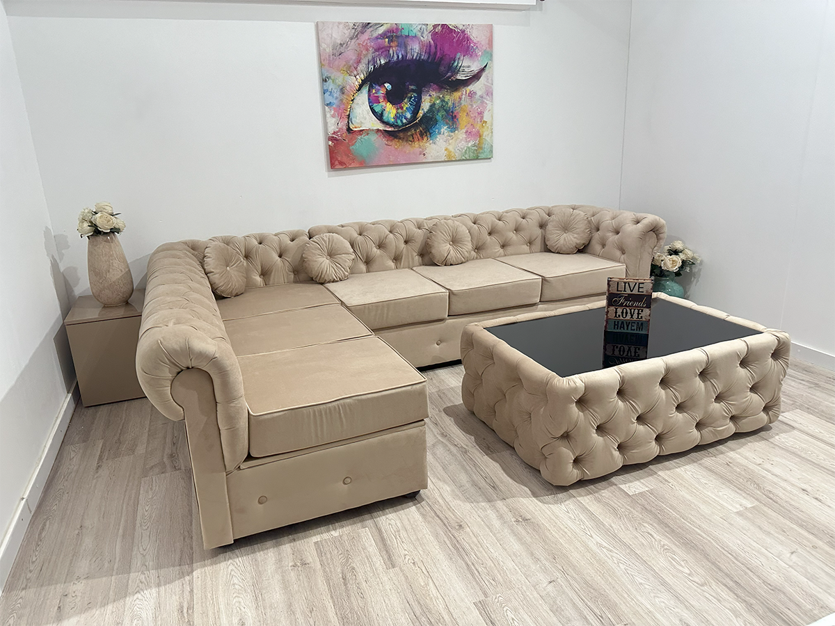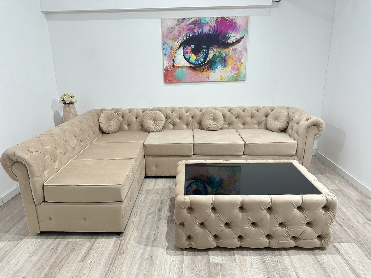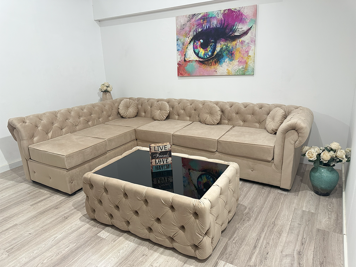 Alege un colțar fix Chesterfield pe nuanță deschisă de crem pentru un decor rafinat și un confort de neegalat. Designul clasic stil Chesterfield se îmbină perfect cu materialul din stofă catifelată de calitate superioară, ce adaugă un plus de eleganță și suavitate în orice încăpere.