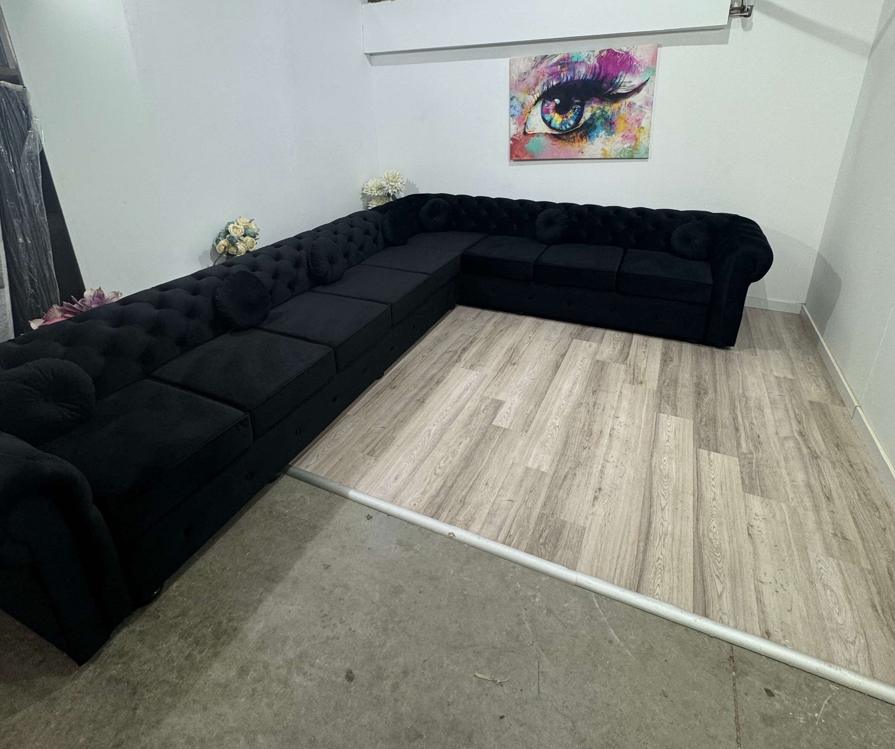 Ridică nivelul livingului tău la un nou standard de eleganță absolută și lux rafinat cu spectaculosul colțar fix model Chesterfield. Cu o dimensiune impunătoare de 400 x 300 cm și 9 locuri generoase, acest colțar devine instant piesa centrală a oricărui decor. Designul său emblematic, inspirat din stilul britanic, aduce un aer de nobilime modernă, iar tapițeria din stofă catifelată în nuanțe de negru intens oferă o senzație de sofisticare și confort la fiecare atingere.