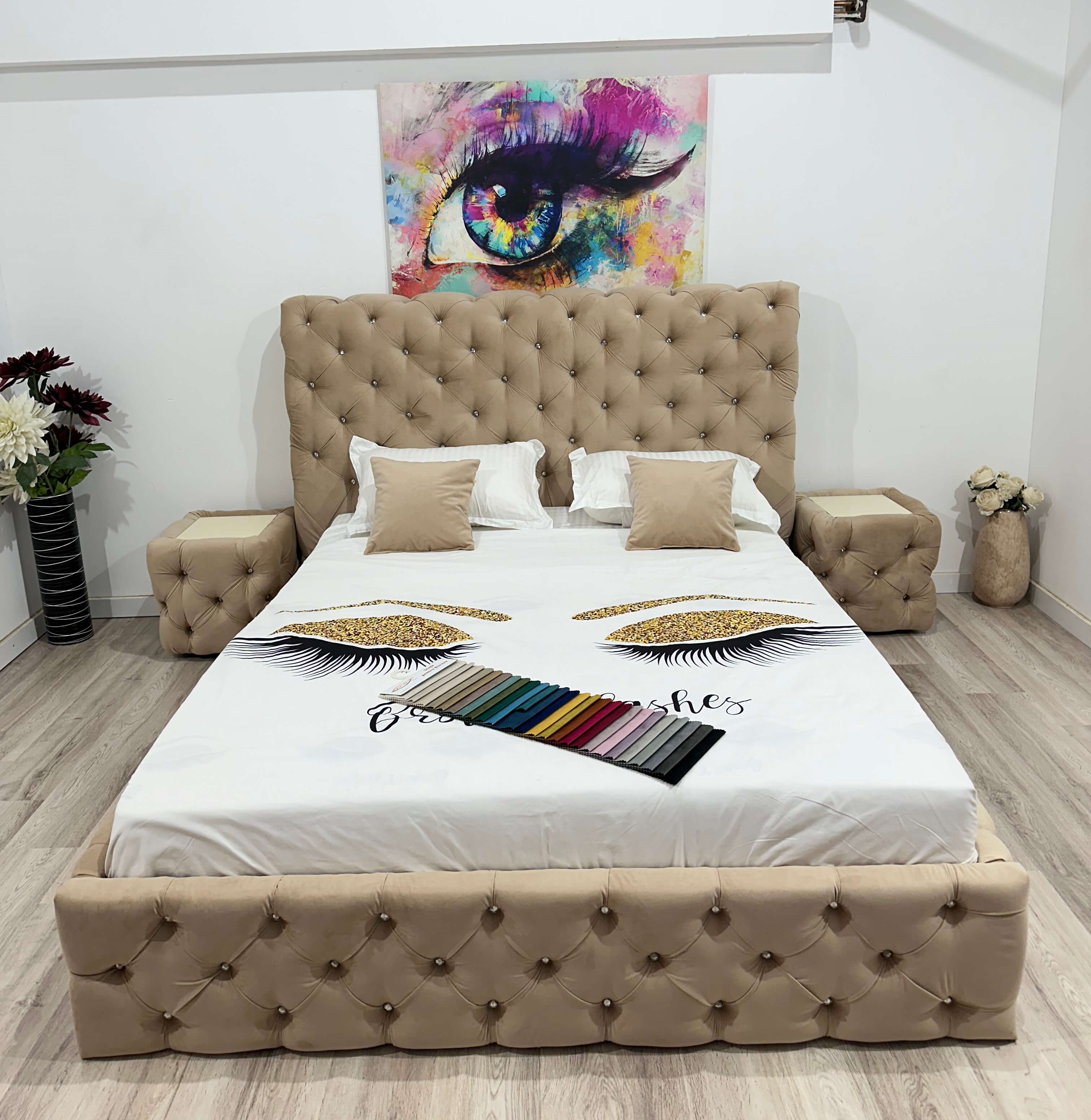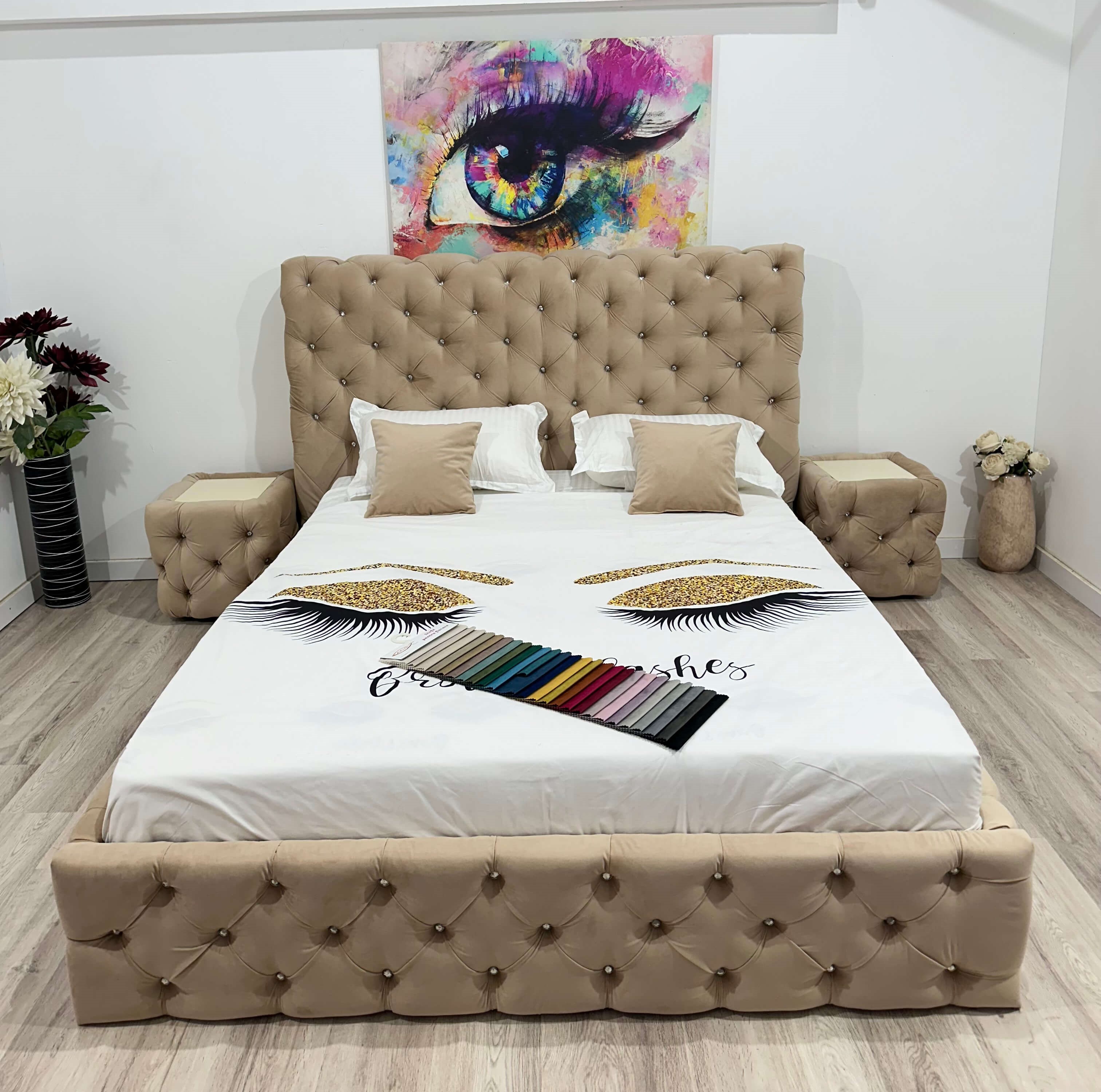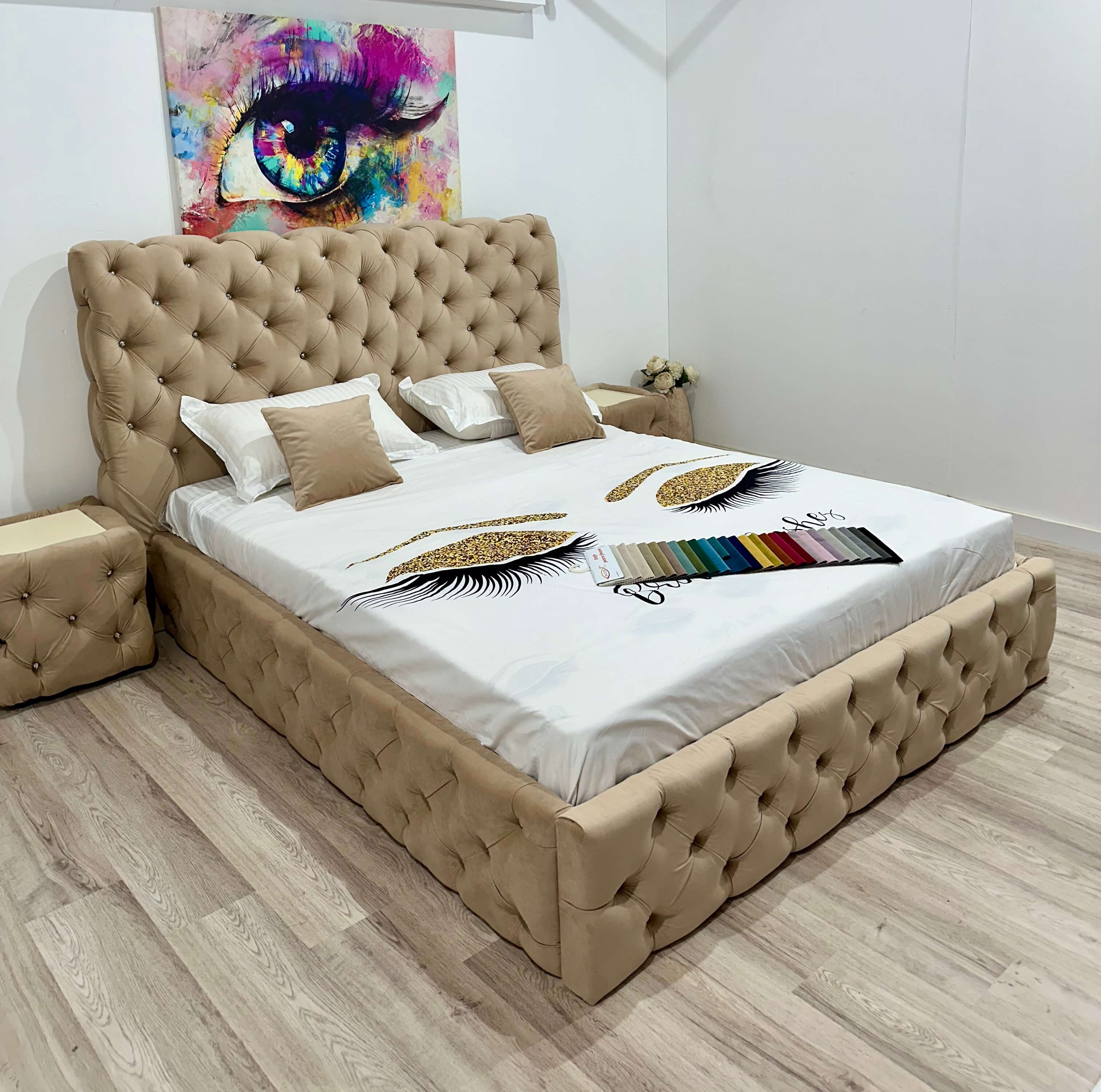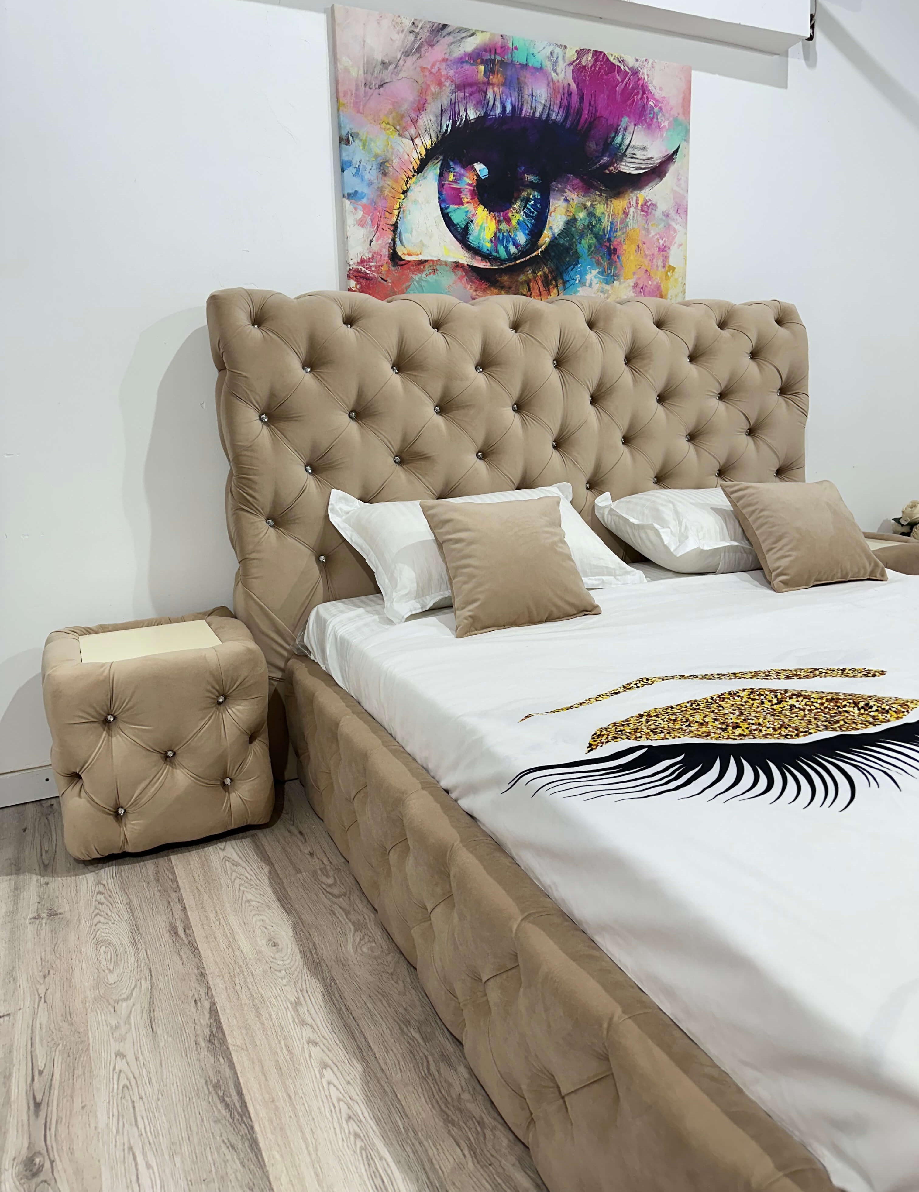 Pat tapițat de mijloc cu tăblie înaltă de 110 cm în stil Chesterfield pentru saltea de 160 x 200 cm, material catifelat, nasturi din sticlă, somieră rabatabilă cu ladă de depozitare mare, dimensiunea finală de 239 x 195 cm, structură din lemn și PAL.