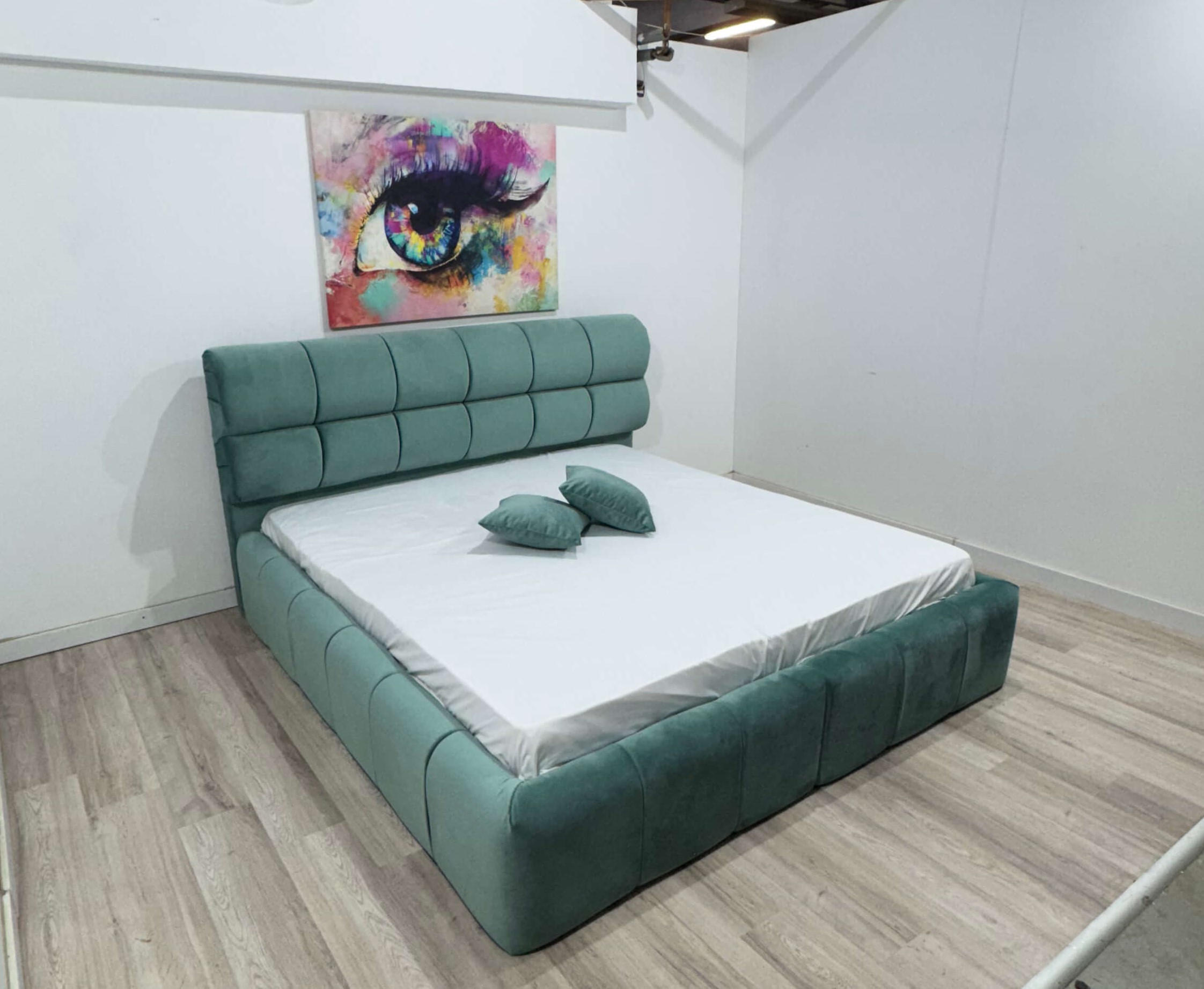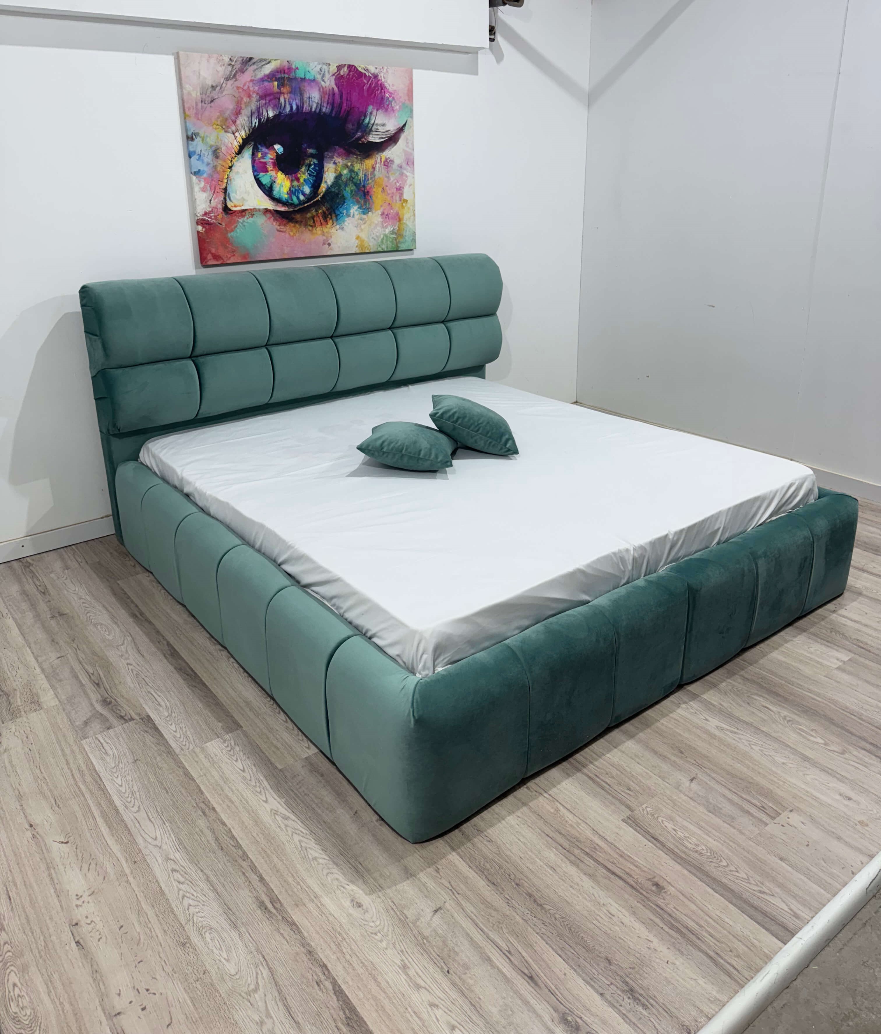 Pat tapițat de mijloc, dimensiune totală de 225 x 185 cm, înalțime tăblie 110 cm, tapițerie din material smart, somieră metalică rabatabilă, ladă depozitare generoasă, structură robustă din lemn și PAL melaminat.