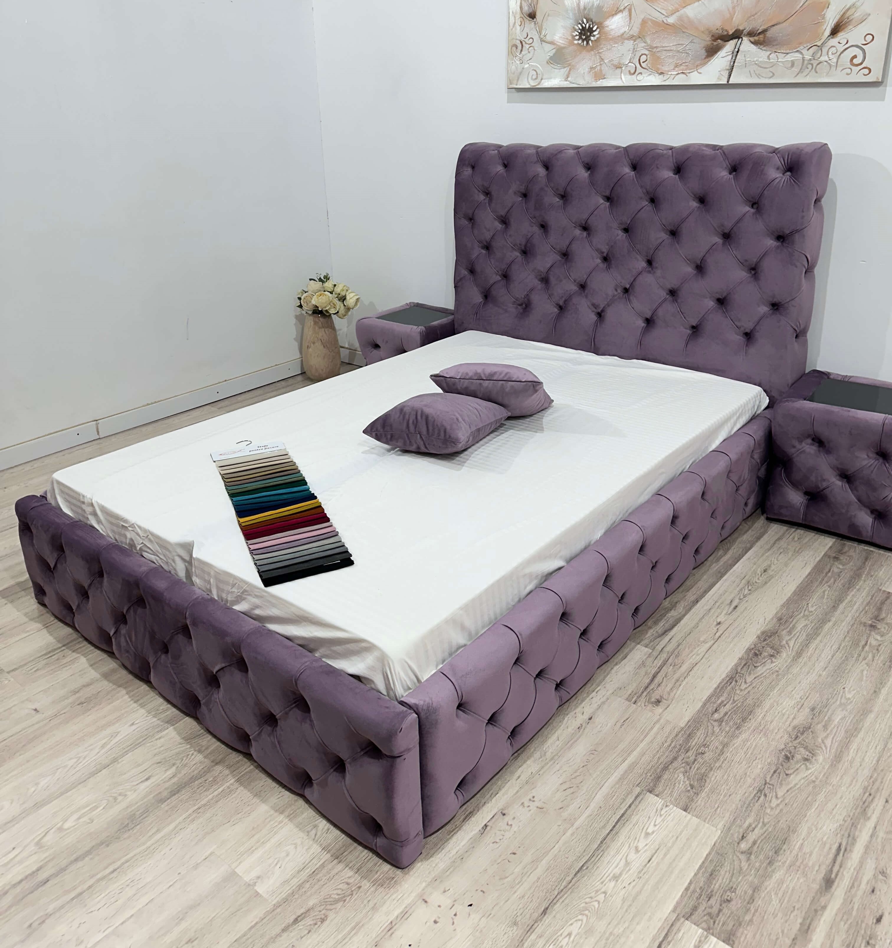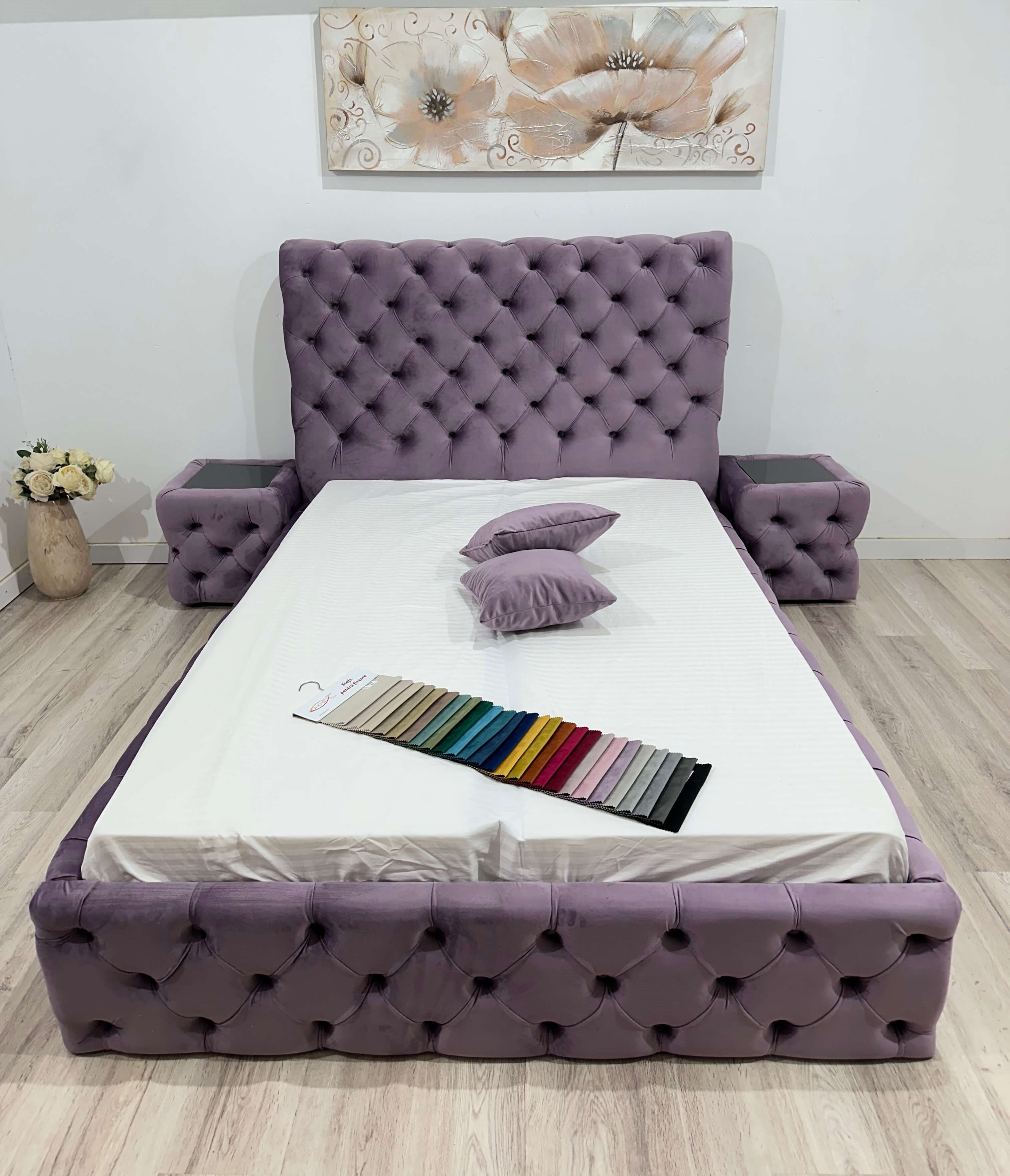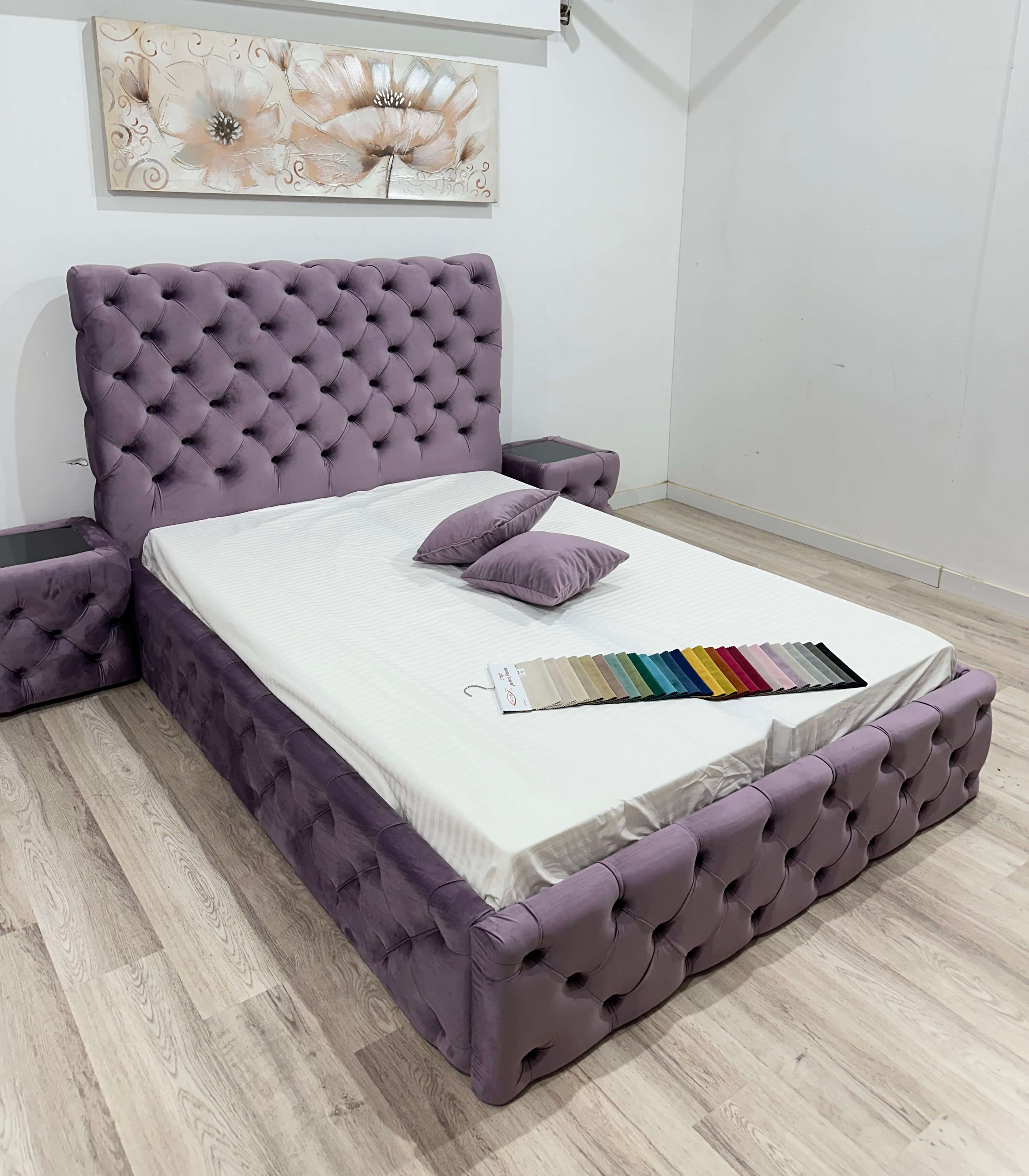 Pat tapițat model LUXURY cu tăblie înaltă de 110 cm, nasturi îmbrăcați, catifea fină, design Chesterfiled, somieră rabatabilă și ladă depozitare mare, structură din PAL și lemn.
