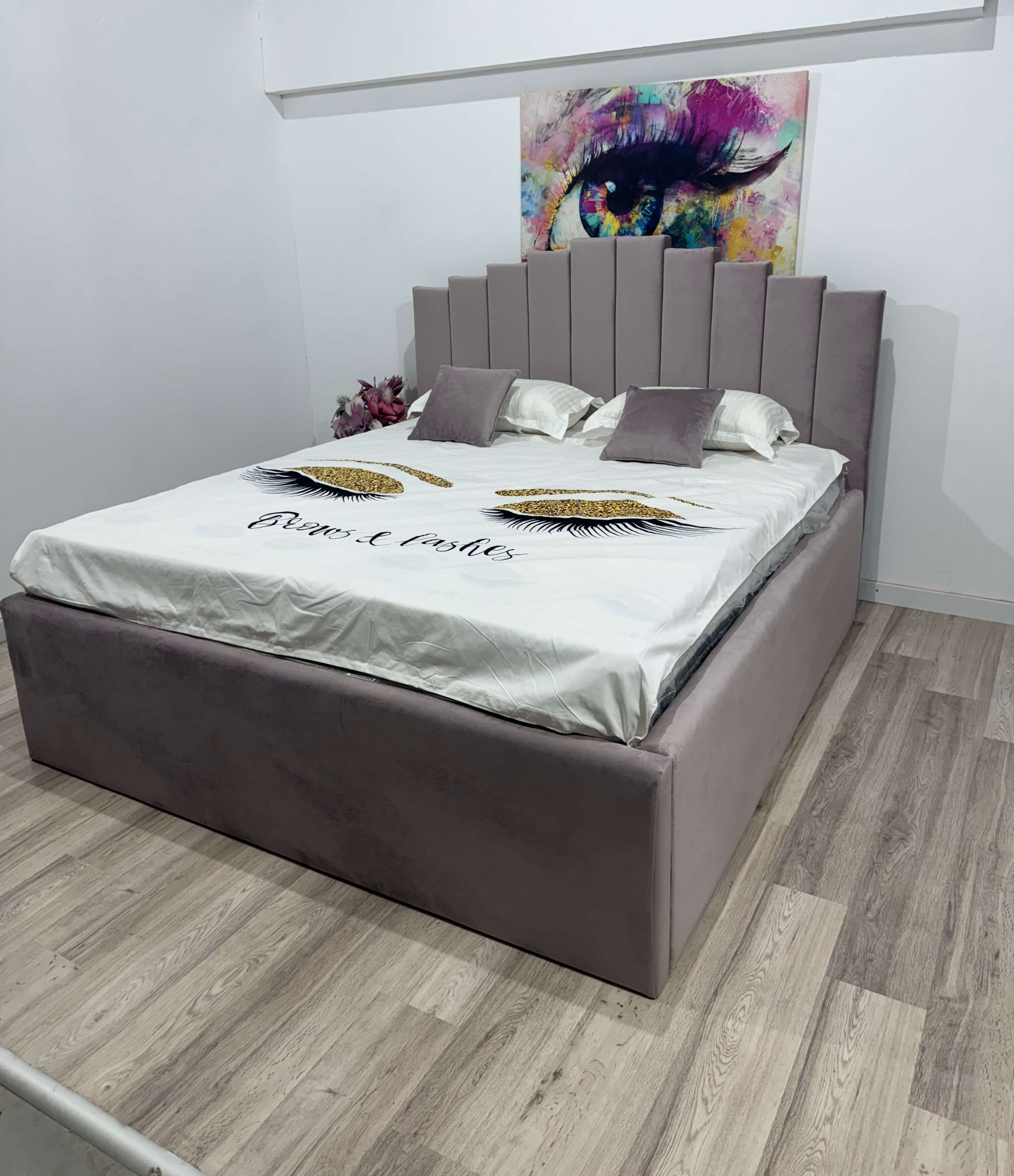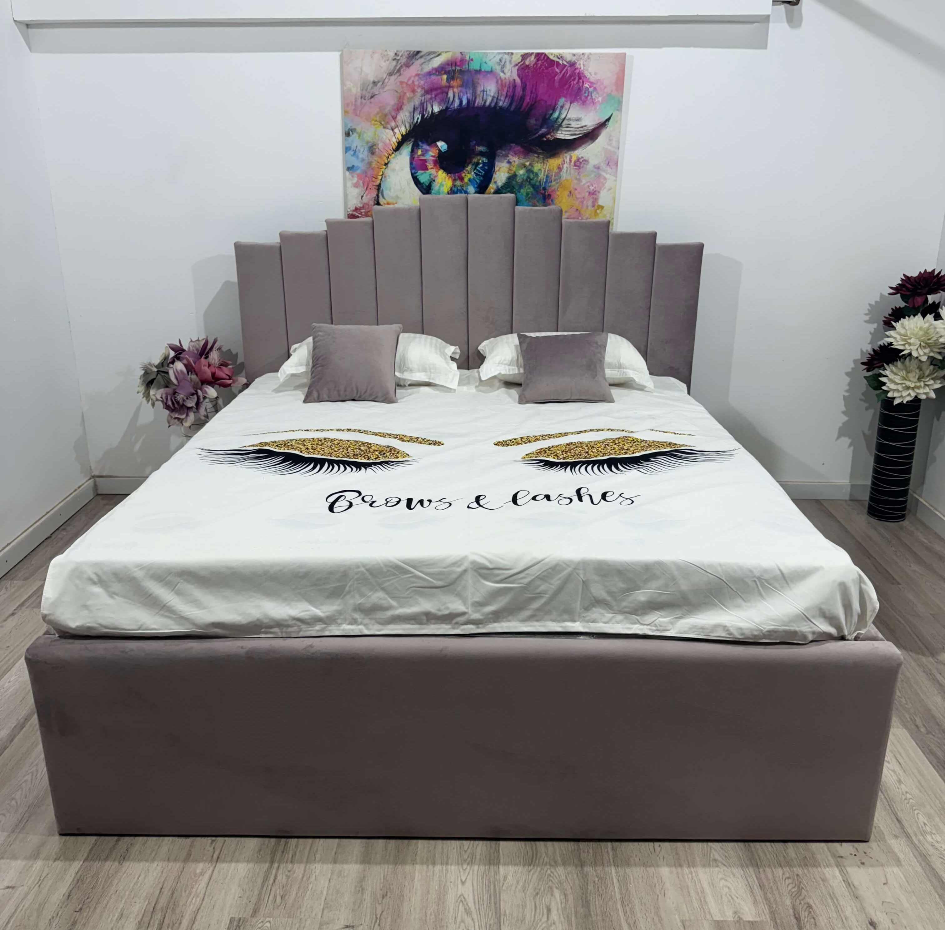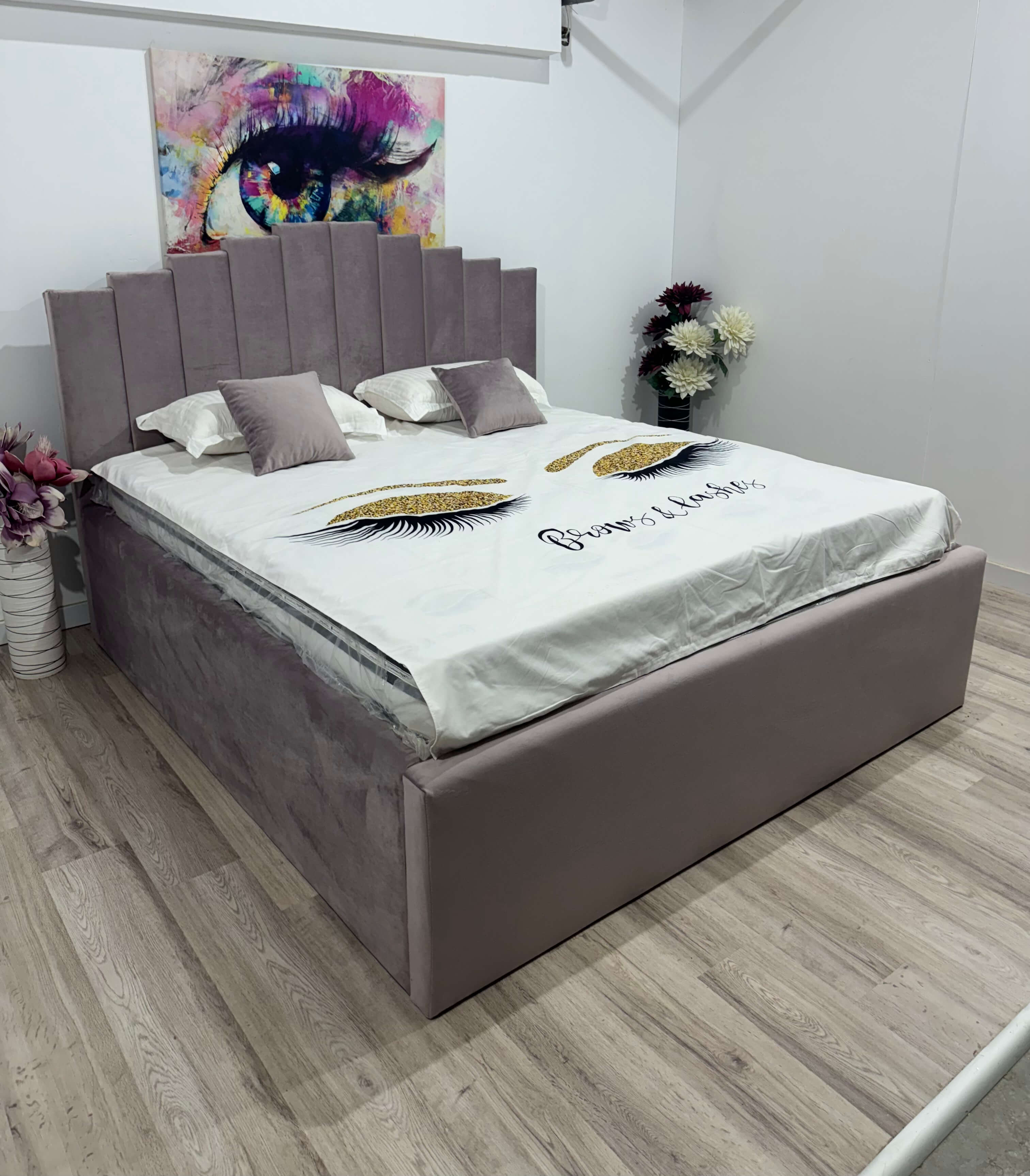 Pat tapițat premium cu design modern, tăblie înaltă de 130 cm, tapițerie din stofă catifelată calitate superioară, dimensiune totală de 220 x 175 cm, structură din lemn și PAL nemelaminat, somieră rabatabilă, ladă depozitare generoasă.