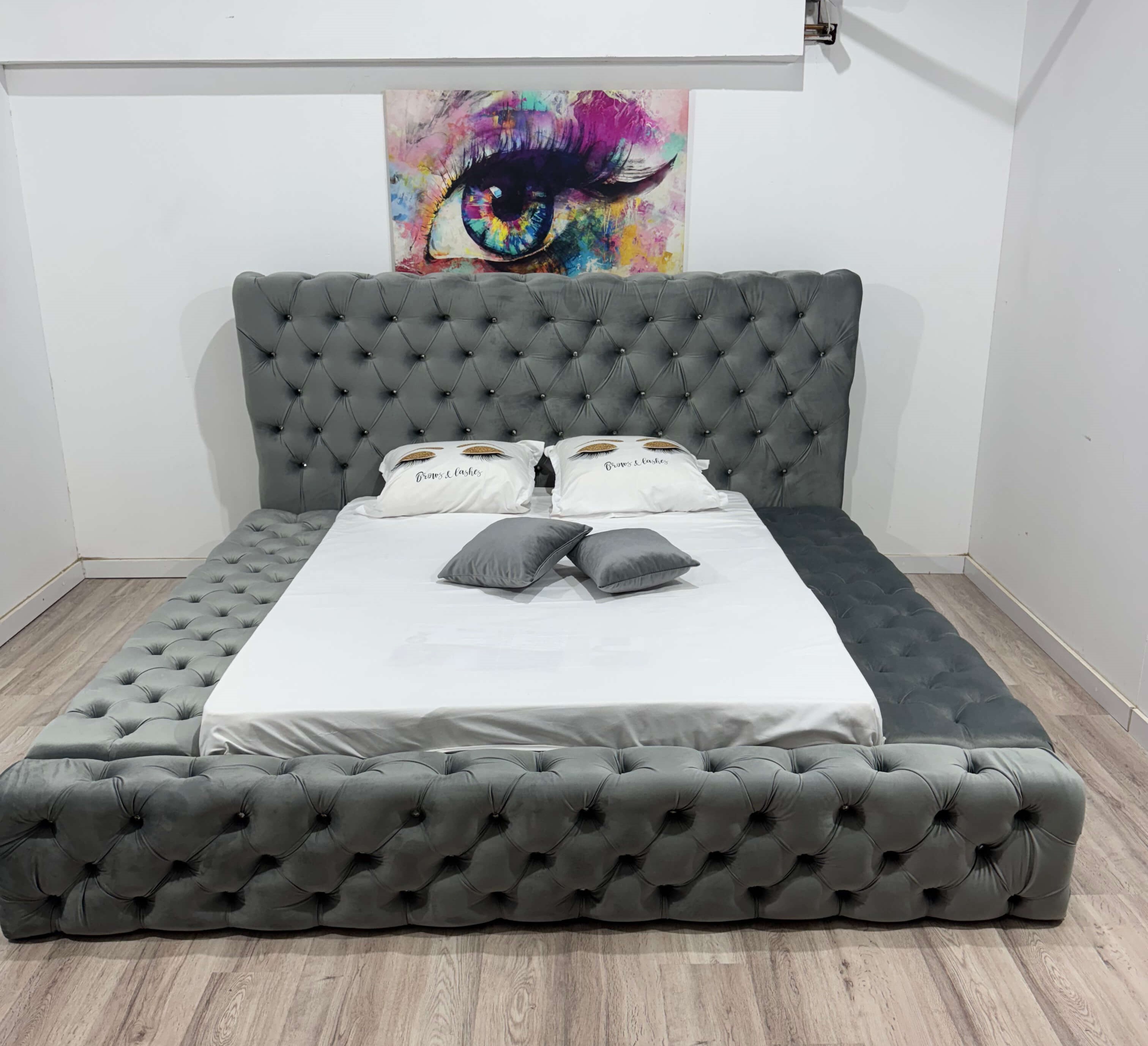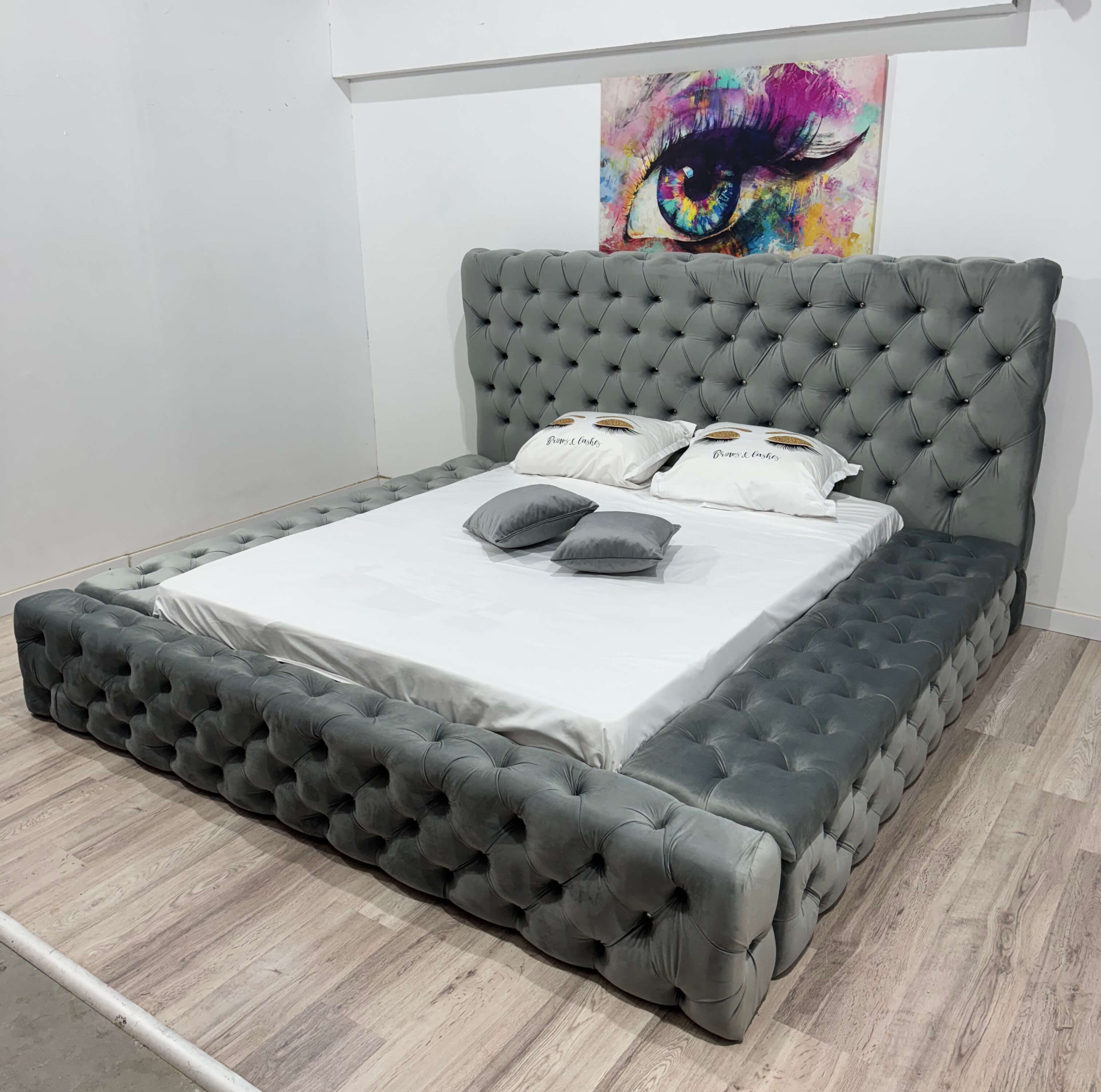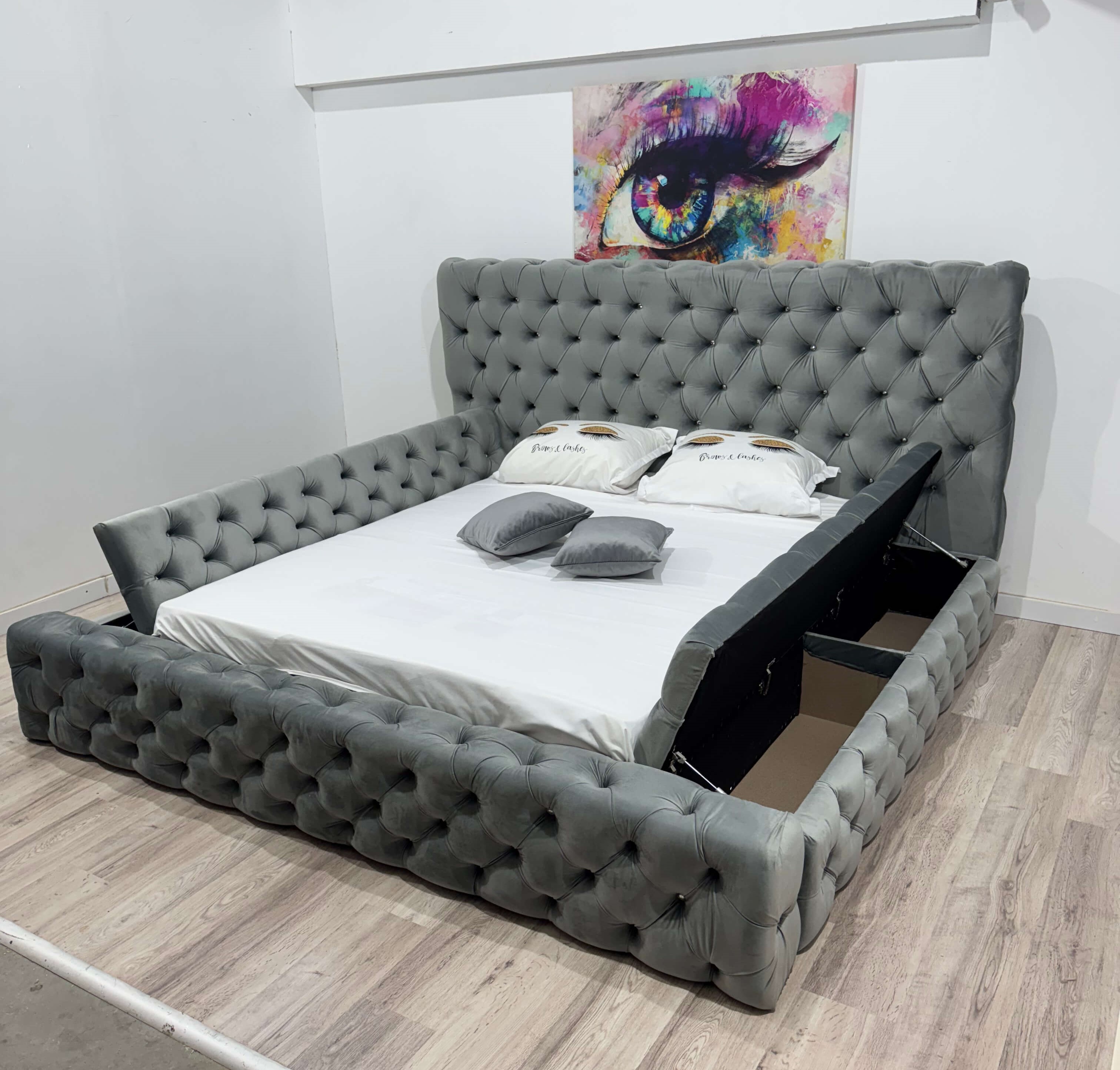 Pat tapițat în stil Chesterfield cu nasturi din sticlă, material catifelat, depozitare inteligentă în brațele laterale, structură din lemn și PAL hidrofugat, somieră rabatabilă cu ladă de depozitare generoasă, saltea de 160 x 200 cm, dimensiunea totală de 240 x 240 cm.