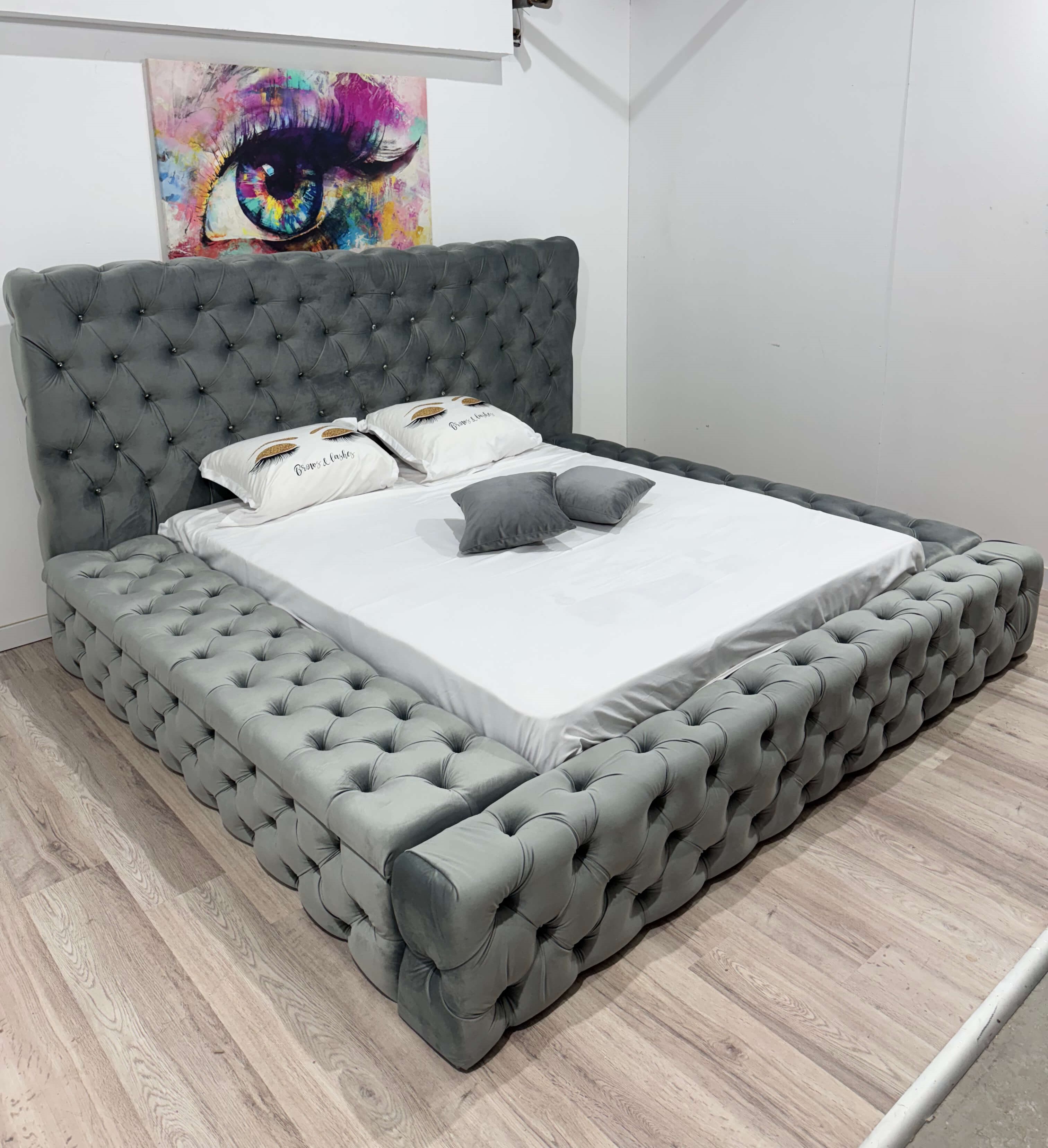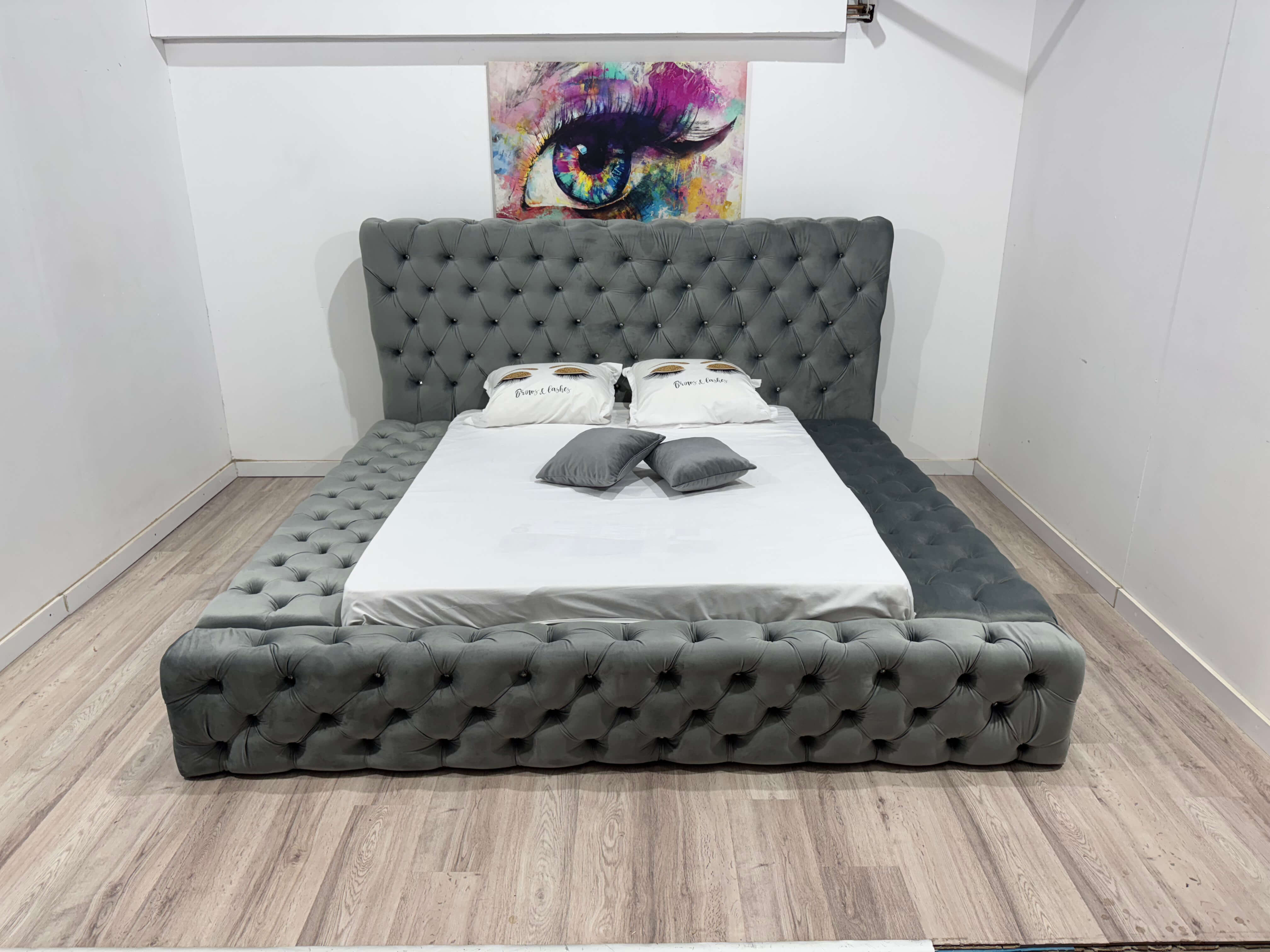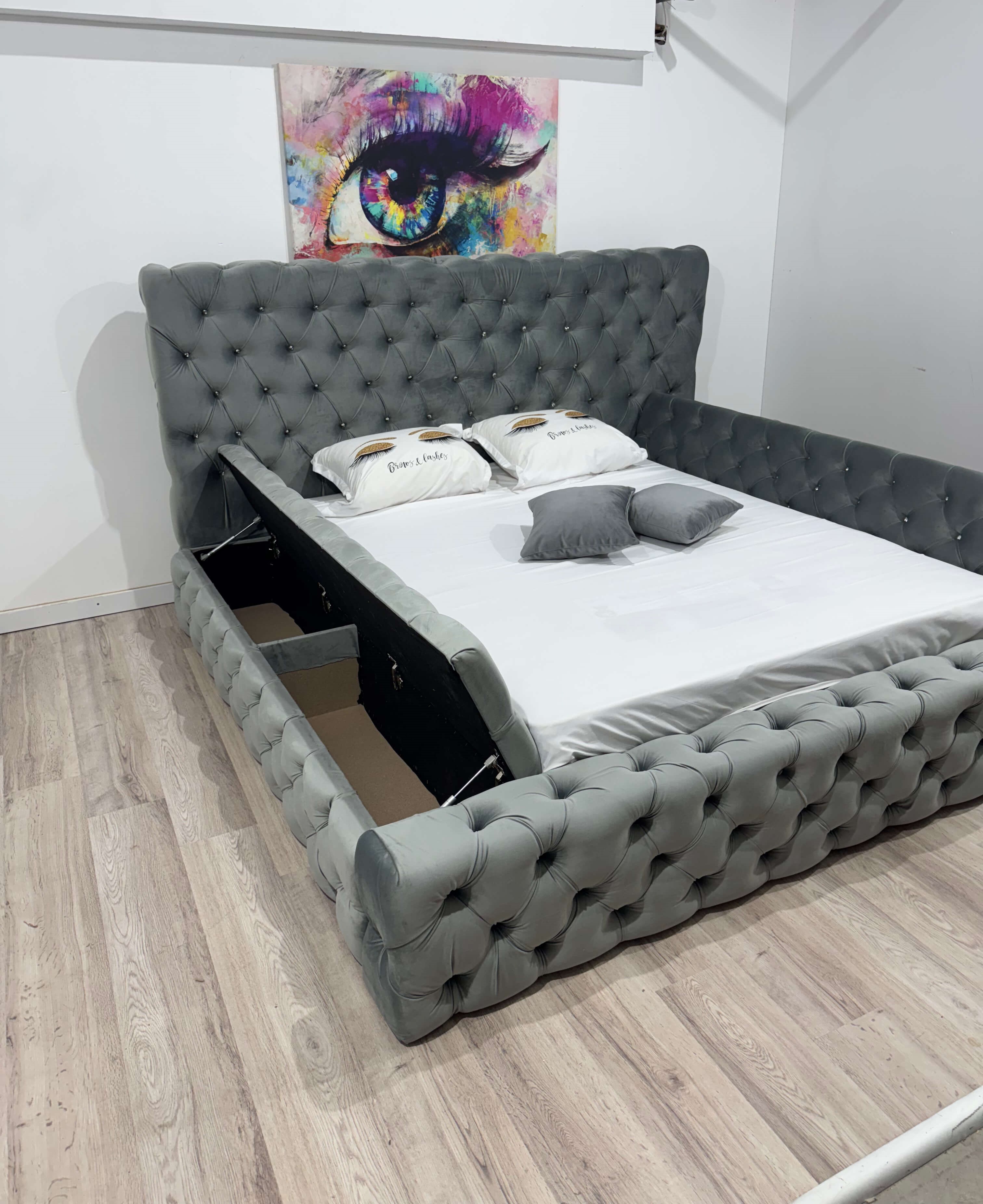 Pat tapițat în stil Chesterfield cu nasturi din sticlă, material catifelat, depozitare inteligentă în brațele laterale, structură din lemn și PAL hidrofugat, somieră rabatabilă cu ladă de depozitare generoasă, saltea de 160 x 200 cm, dimensiunea totală de 240 x 240 cm.