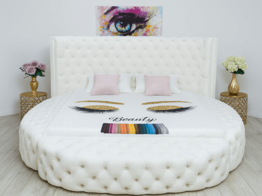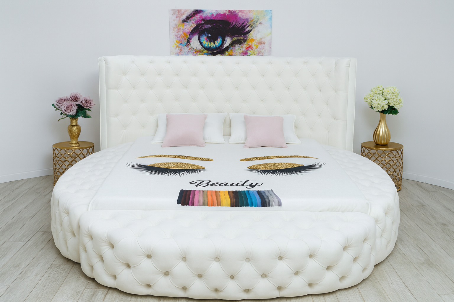 Pat tapițat de mijloc pentru dormitor matrimonial, tapițerie din catifea, tăblie stil Chesterfield, conceput pentru saltea de 160 x 200 cm, dimensiune totală de 245 x 255 cm, somieră rabatabilă și ladă de depozitare incăpătoare.