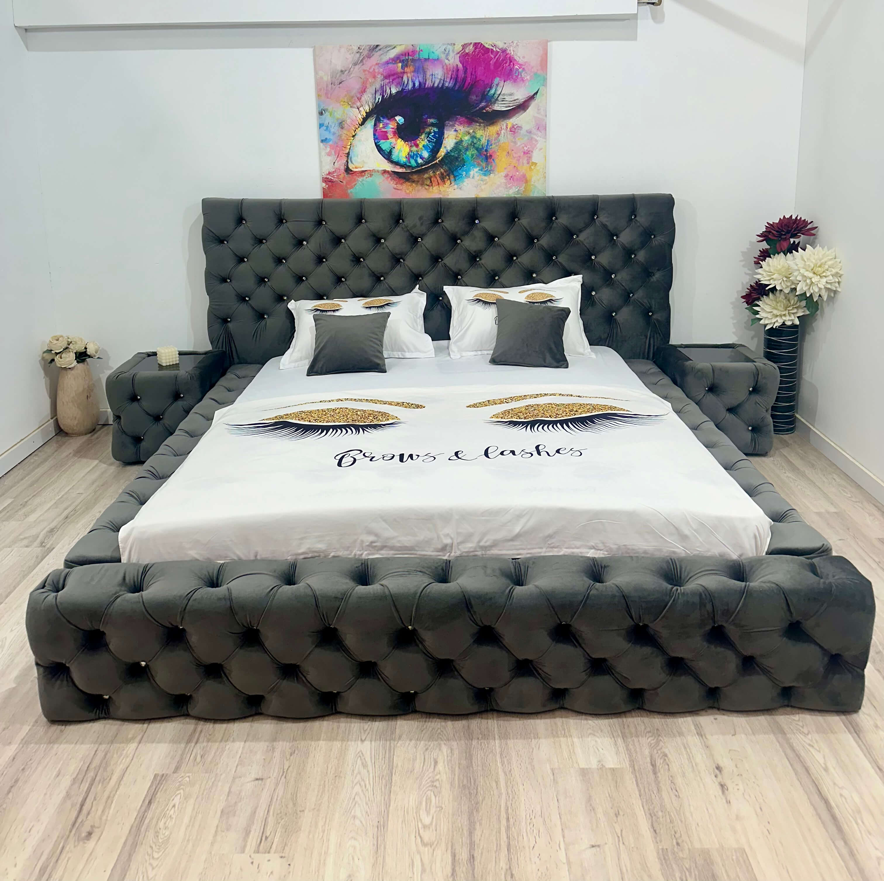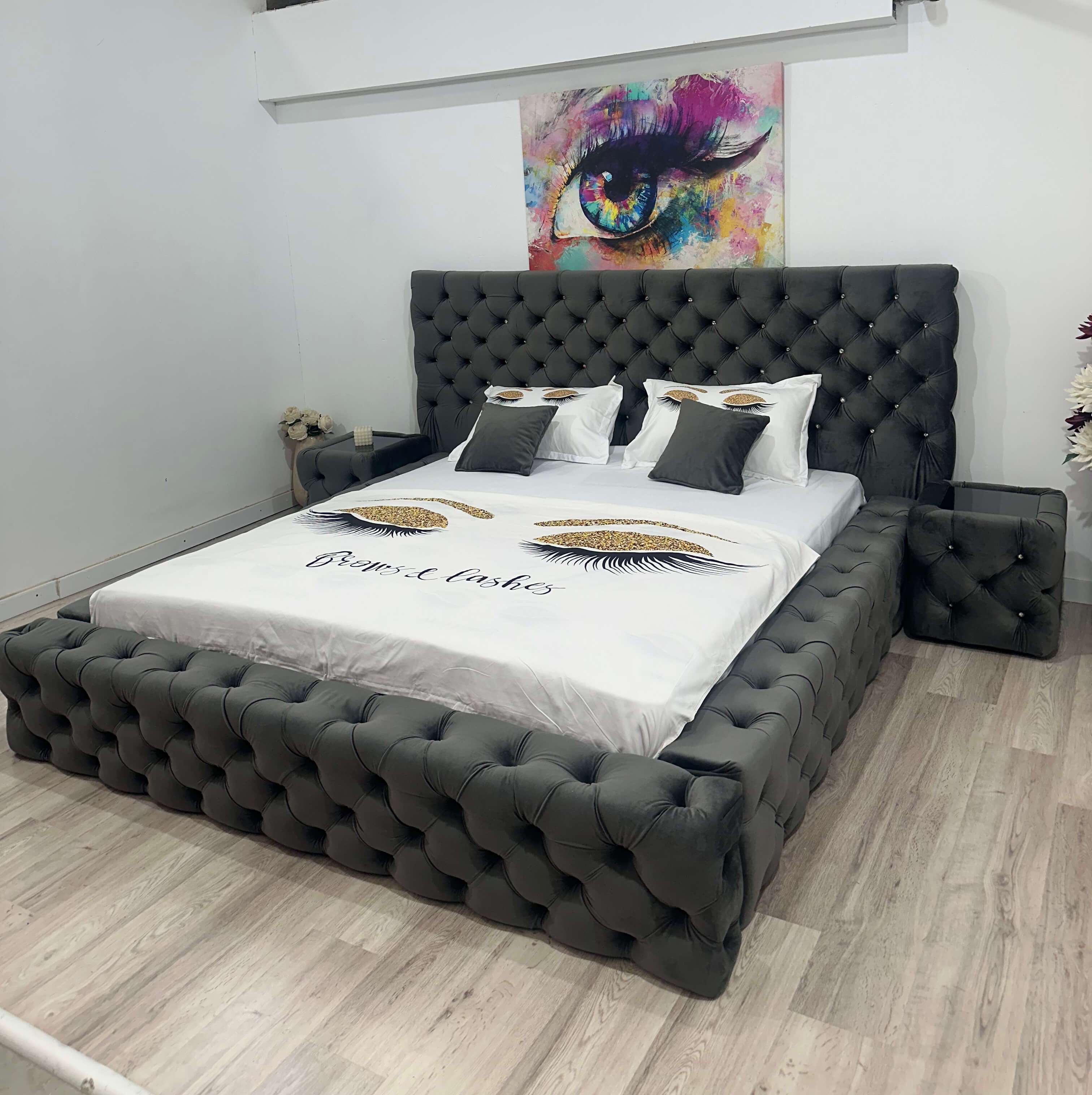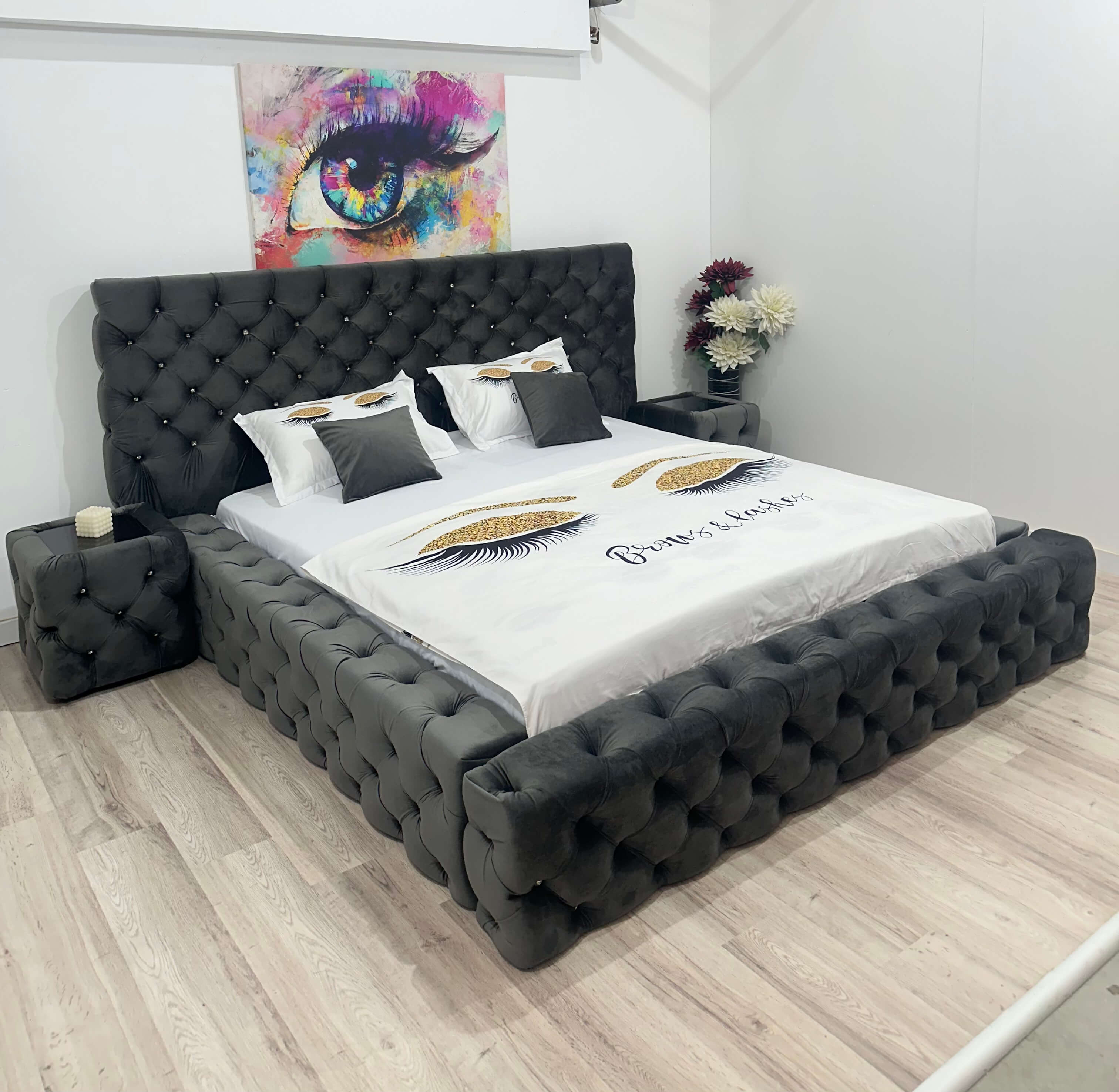 Pat mare 220 x 240 cm pentru saltea 160 x 200 cm, design Chesterfield, nasturi din sticlă, catifea gri închis, tăblie înaltă, somieră rabatabilă, ladă depozitare, cadru din lemn și PAL, 2 noptiere incluse.