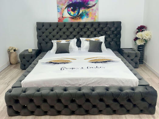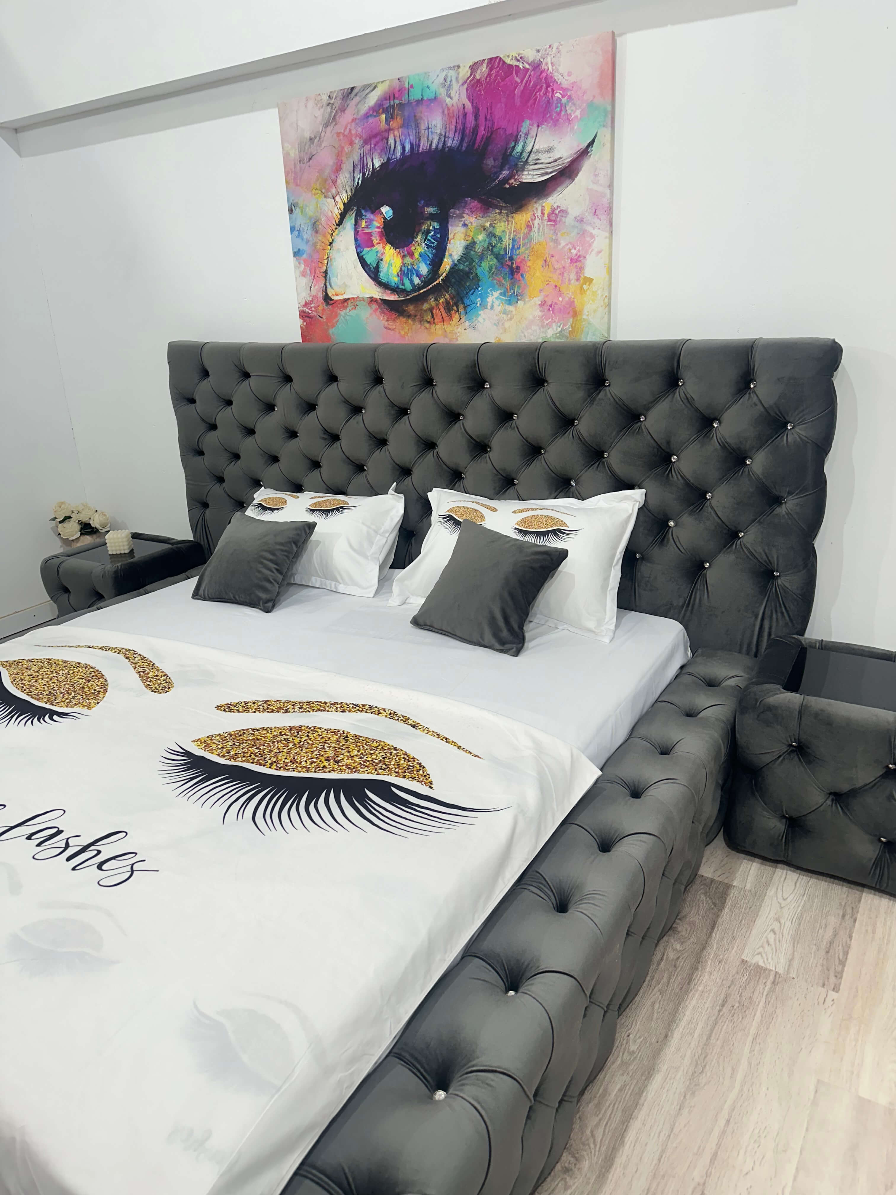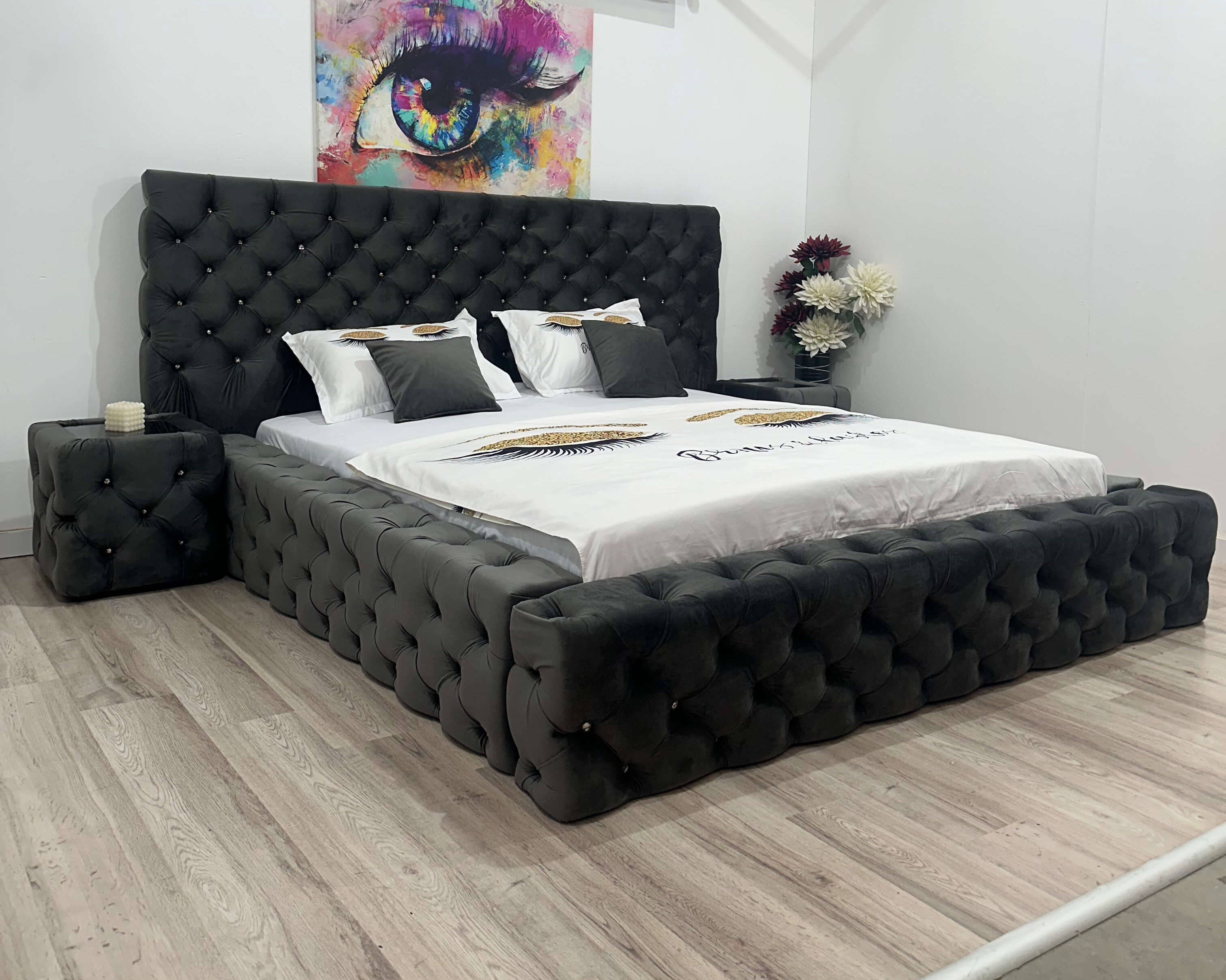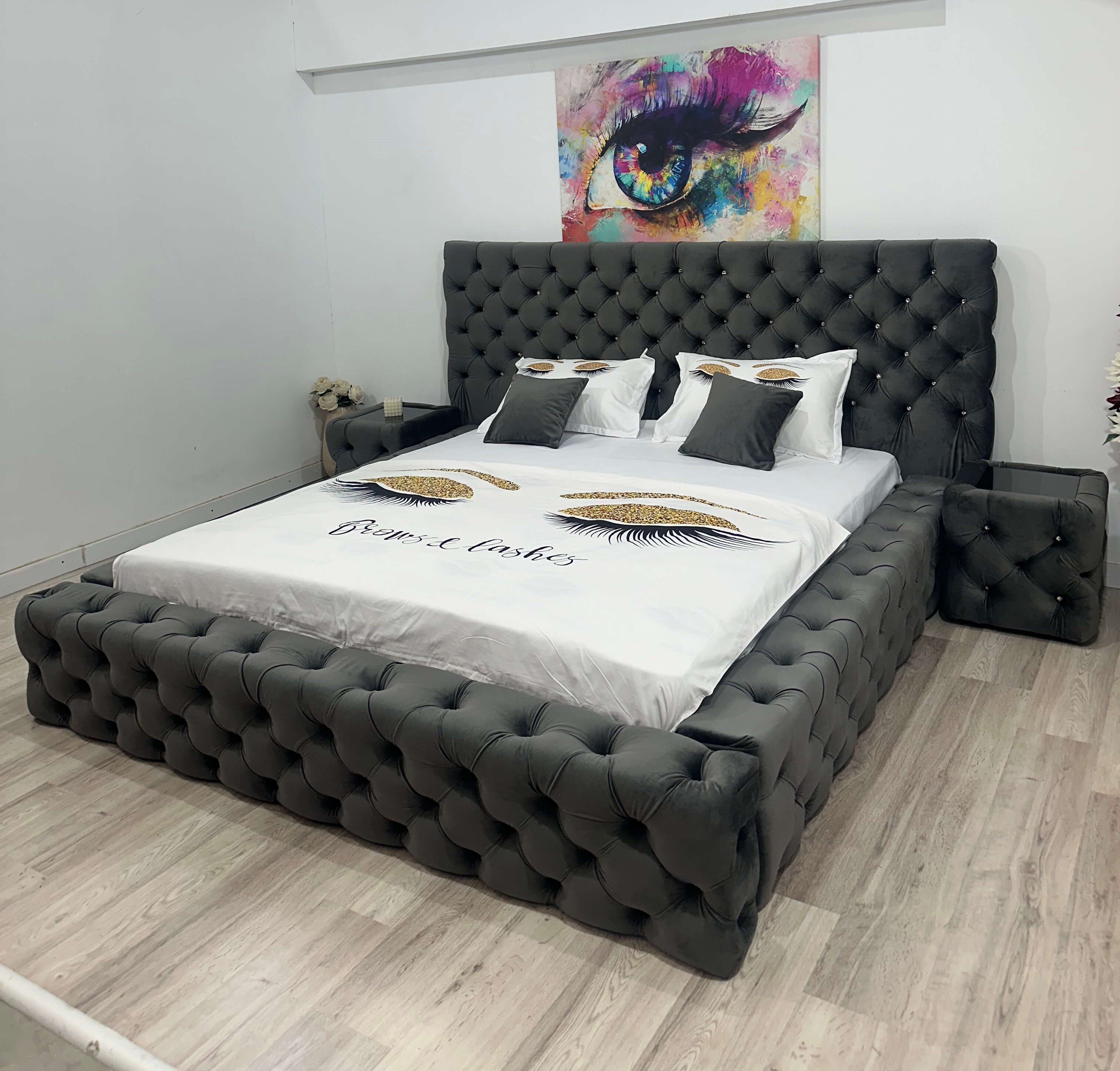 Pat mare 220 x 240 cm pentru saltea 160 x 200 cm, design Chesterfield, nasturi din sticlă, catifea gri închis, tăblie înaltă, somieră rabatabilă, ladă depozitare, cadru din lemn și PAL, 2 noptiere incluse.